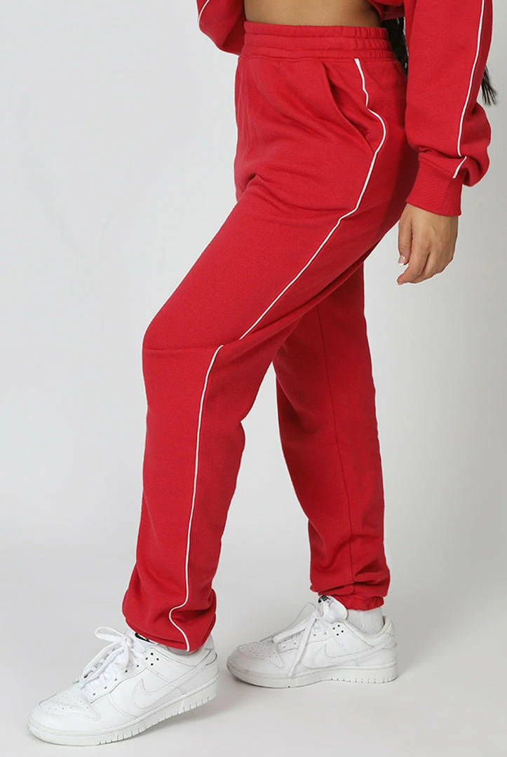 OVERSIZED FIT 90S STYLE JOGGERS IN RED. PAIR WITH THE OVERSIZED VARSITY PIPING DETAIL SWEATSHIRT RED FOR THE ULTIMATE SET.