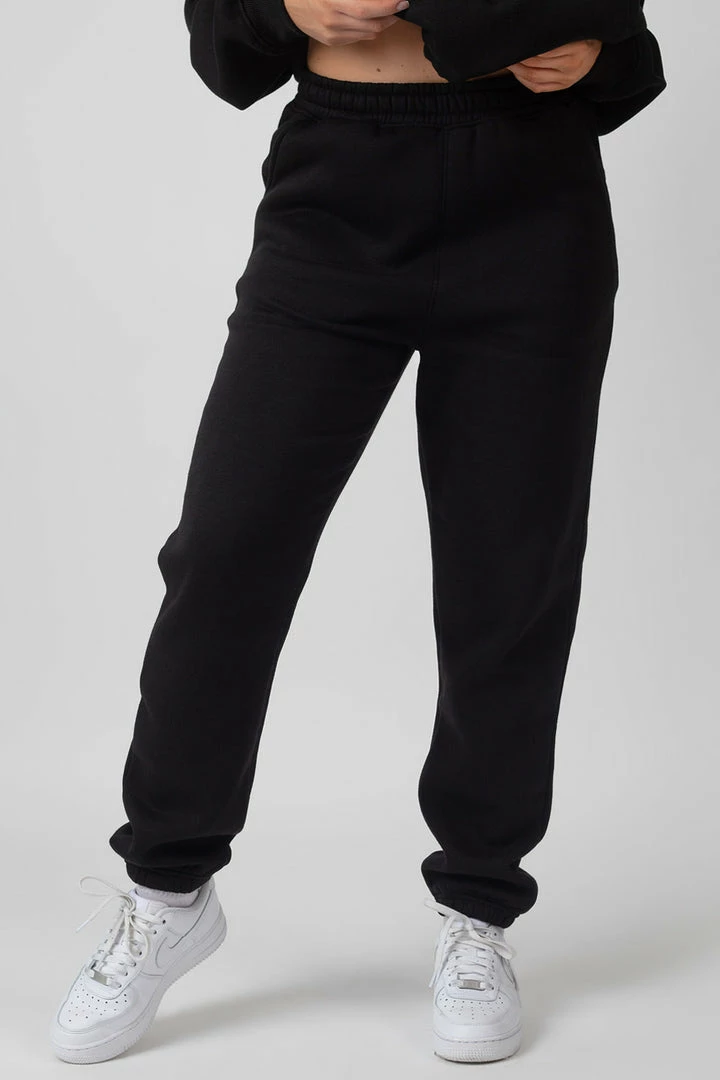 A jogger with an oversized fit featuring elasticated waists and cuffs and pockets in black.
