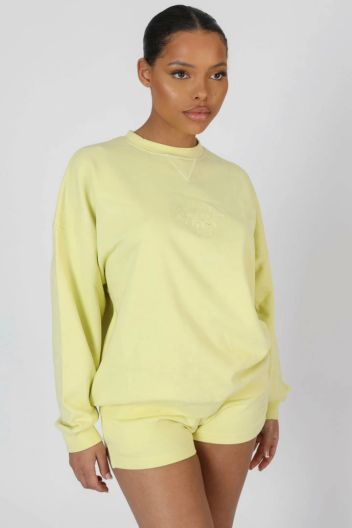 AN OVERSIZED FIT SWEATSHIRT IN LEMON WITH AMALFI COAST EMBROIDERED ON THE FRONT. PAIR WITH THE LEMON SIDE SPLIT SHORTS OR THE SEAM FRONT 90S JOGGERS IN LEMON FOR THE ULTIMATE SETS.