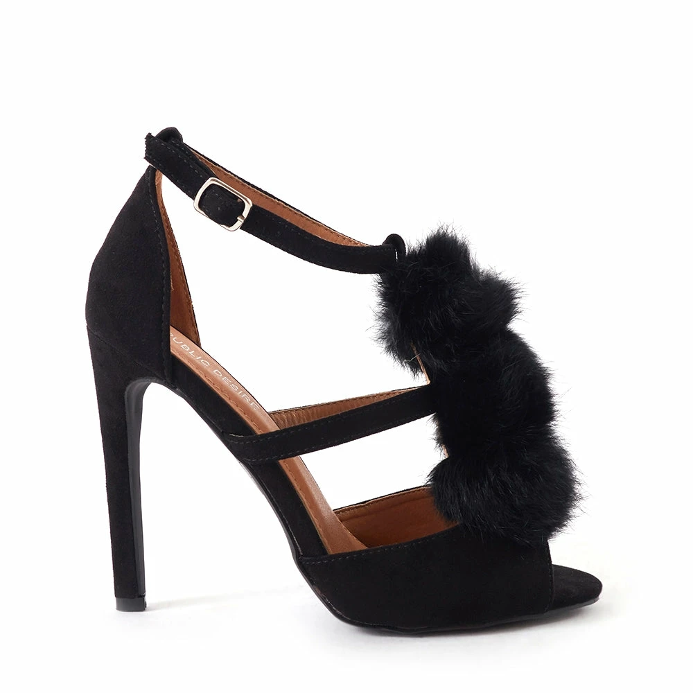 Public Desire UK Andrea Furry Pom Pom Heels In Black Faux Suede