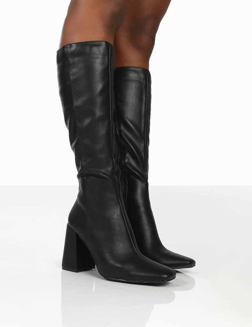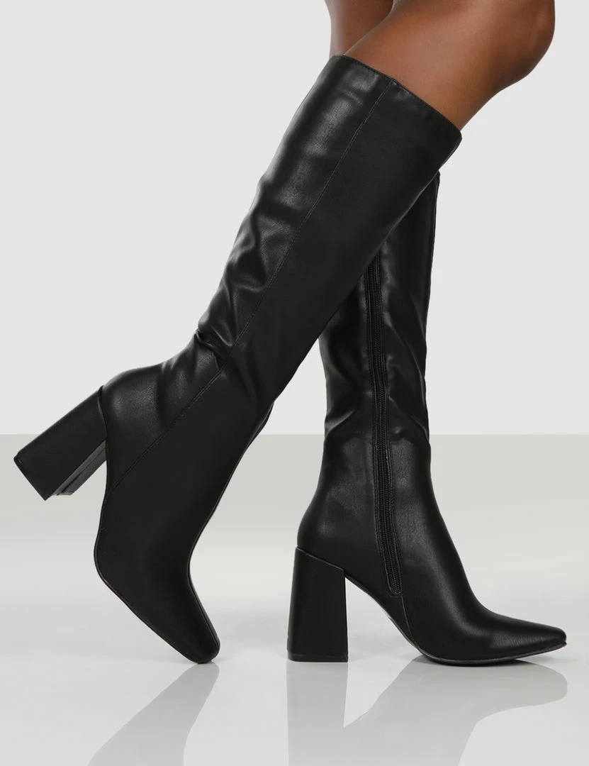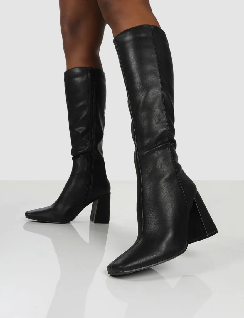 Apology features a block heel with pointed toe. These knee high block heeled boots are the perfect statement shoe.