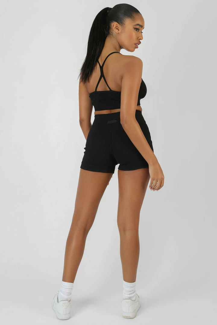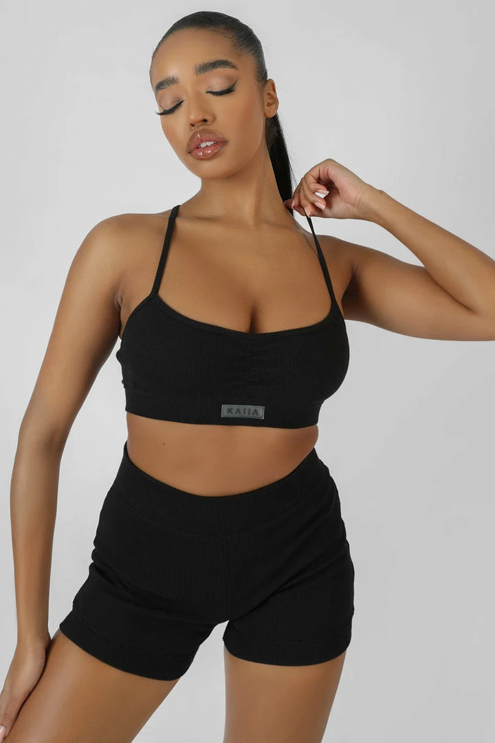 AN ATHLEISURE WEAR STYLE RUCHED FRONT CROSS BACK BLACK RIBBED BRALET.