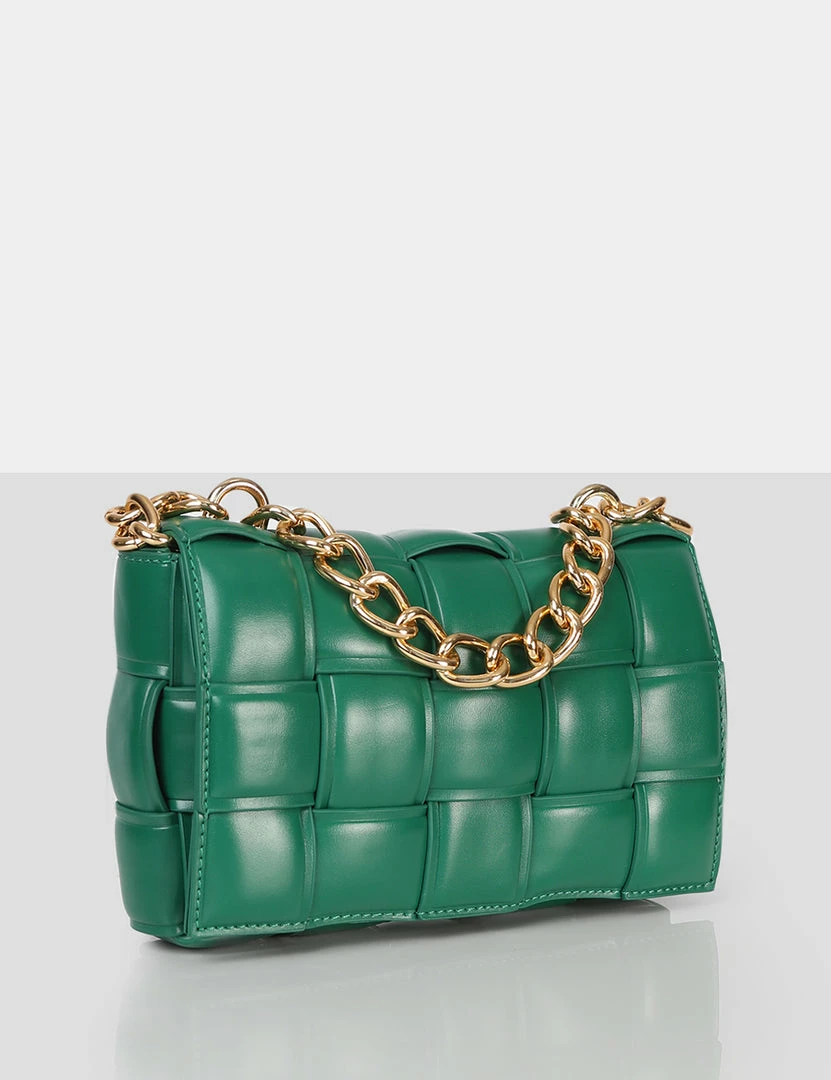 Get ready to slay with Brodie, a must-have woven detail and gold chain shoulder bag in green. This style of women’s bags is a game changer and will make your nights out so much more fun.