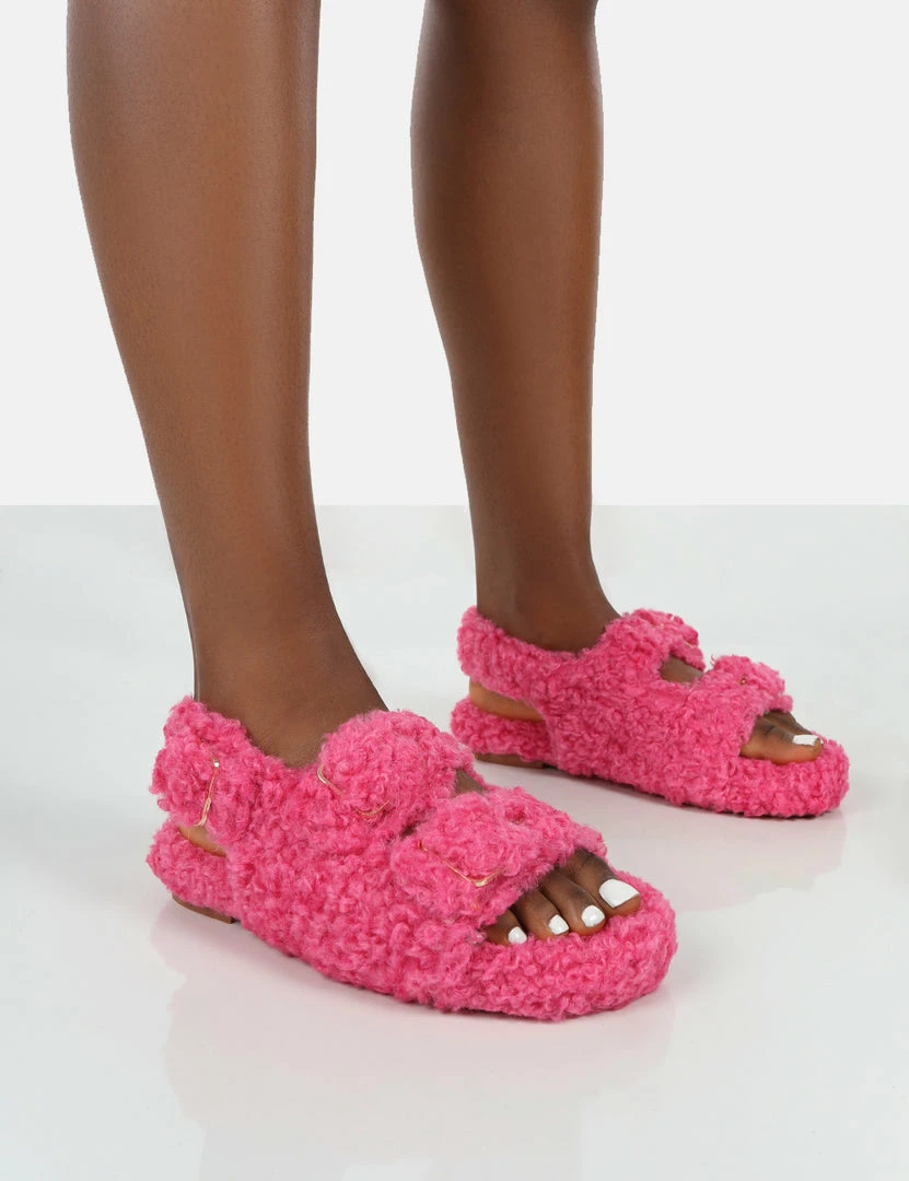 One of this seasons hottest trends, borg faux fur sandals..you asked, we listened! Introducing Bliss in fuchsia, a super cool sporty style grandad sandal featuring borg material and gold buckle detailing. We’re obsessed and these are an absolute MUST HAVE. Style with black patterend tights for a high fashion, Influencer approved look that will defo look fab on the gram! Add these women’s sandals to your women’s flats collection today…