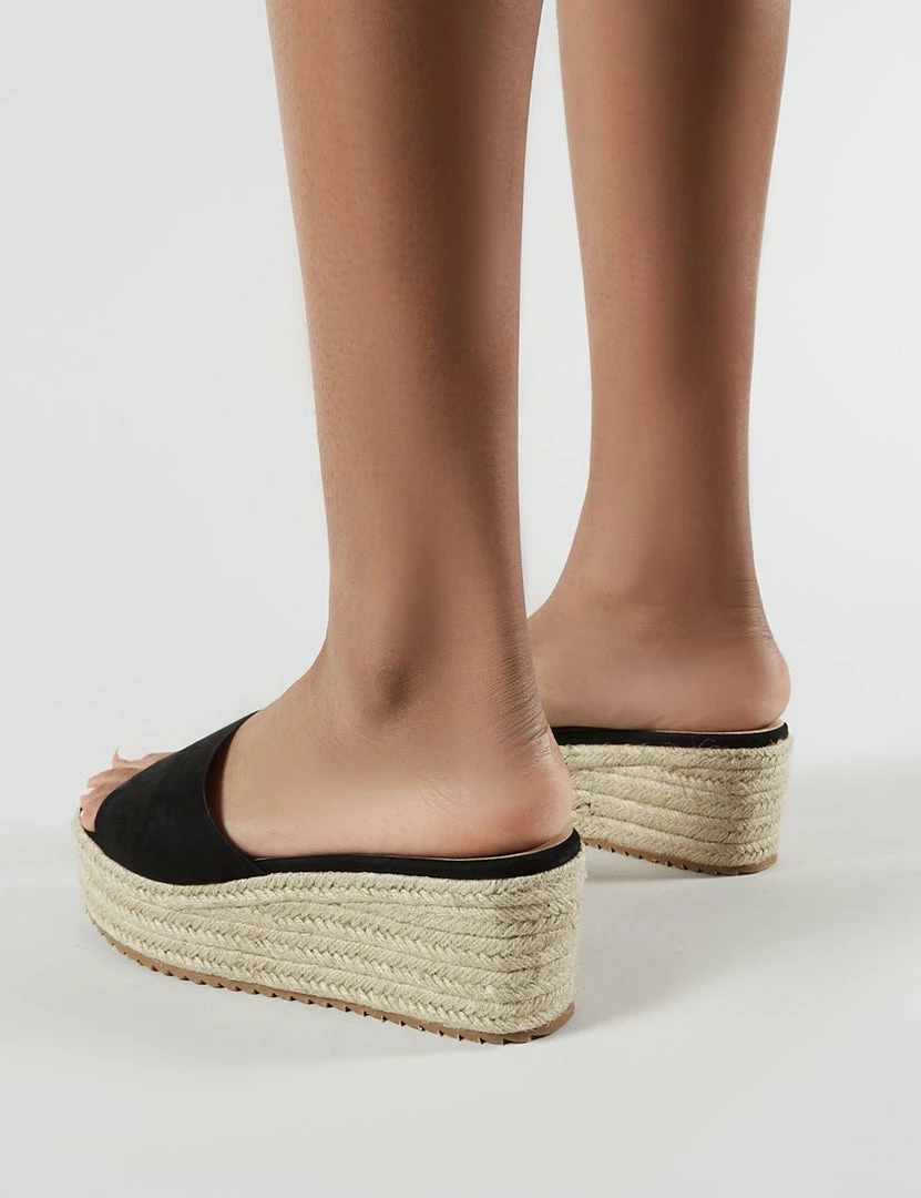 Slide into this seasons hottest sandals. Cami features an espadrille style woven flatform sole and black faux suede upper. Style with denim shorts and a graphic tee.
