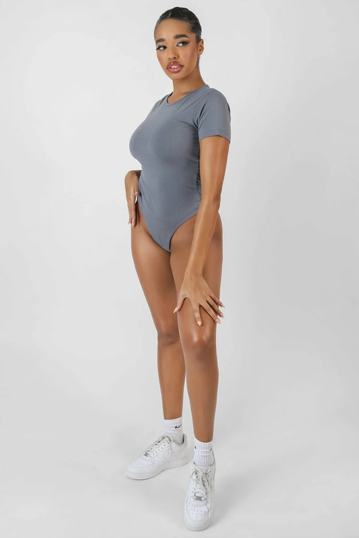 A CAP SLEEVE BODYSUIT IN DARK GREY WITH A CREW NECK