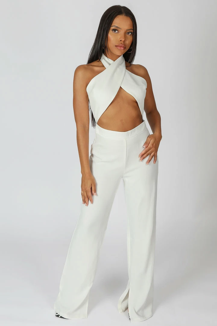 A BACKLESS WHITE CROSS FRONT HALTERNECK JUMPSUIT WITH WIDE LEG TROUSERS