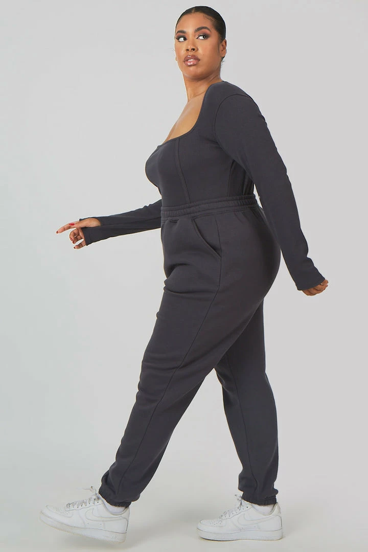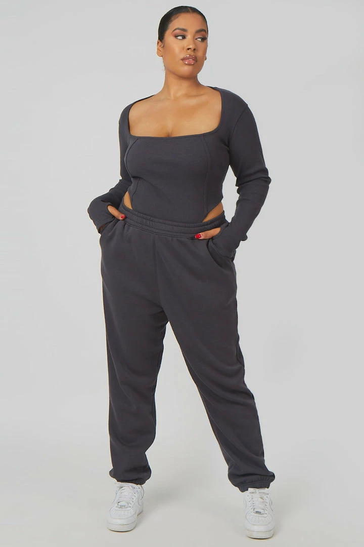 A long sleeve bodysuit in dark grey with extreme high leg.