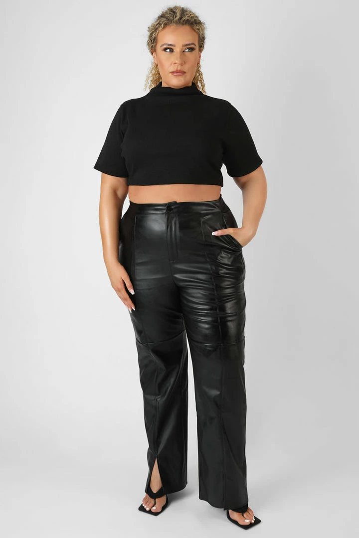 A high neck crop top in black made of a flattering ribbed material with short sleeves.