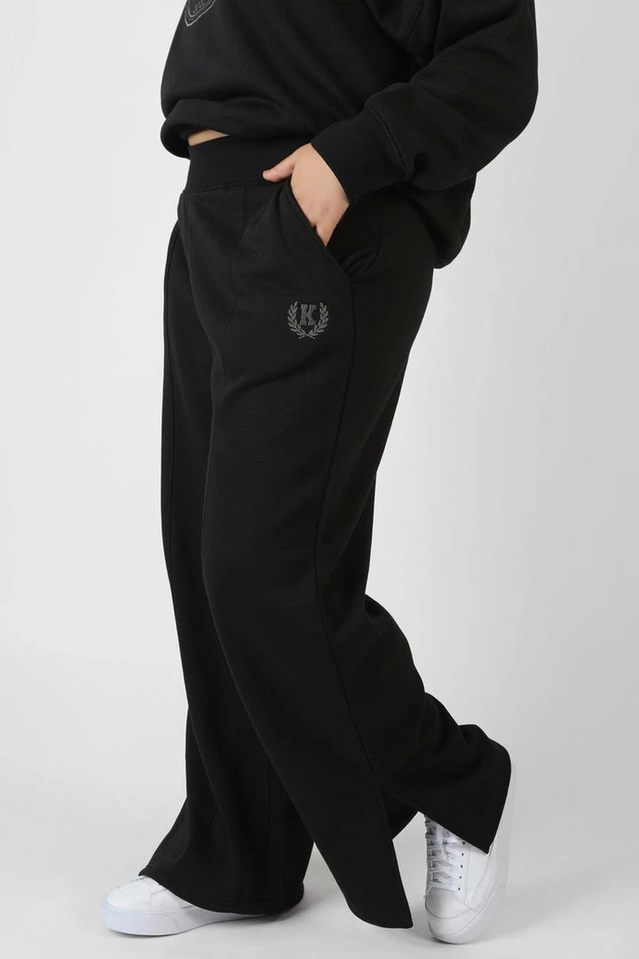 Straight leg black joggers split hems and seams with an elasticated waist.