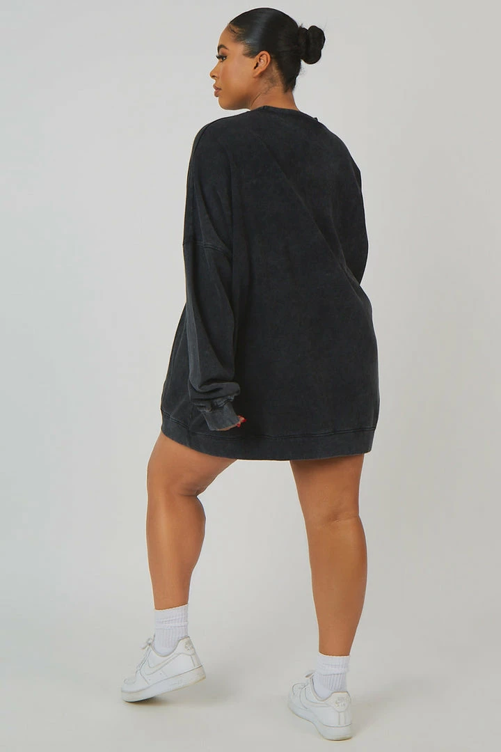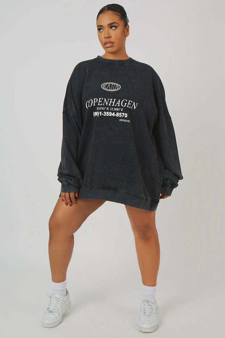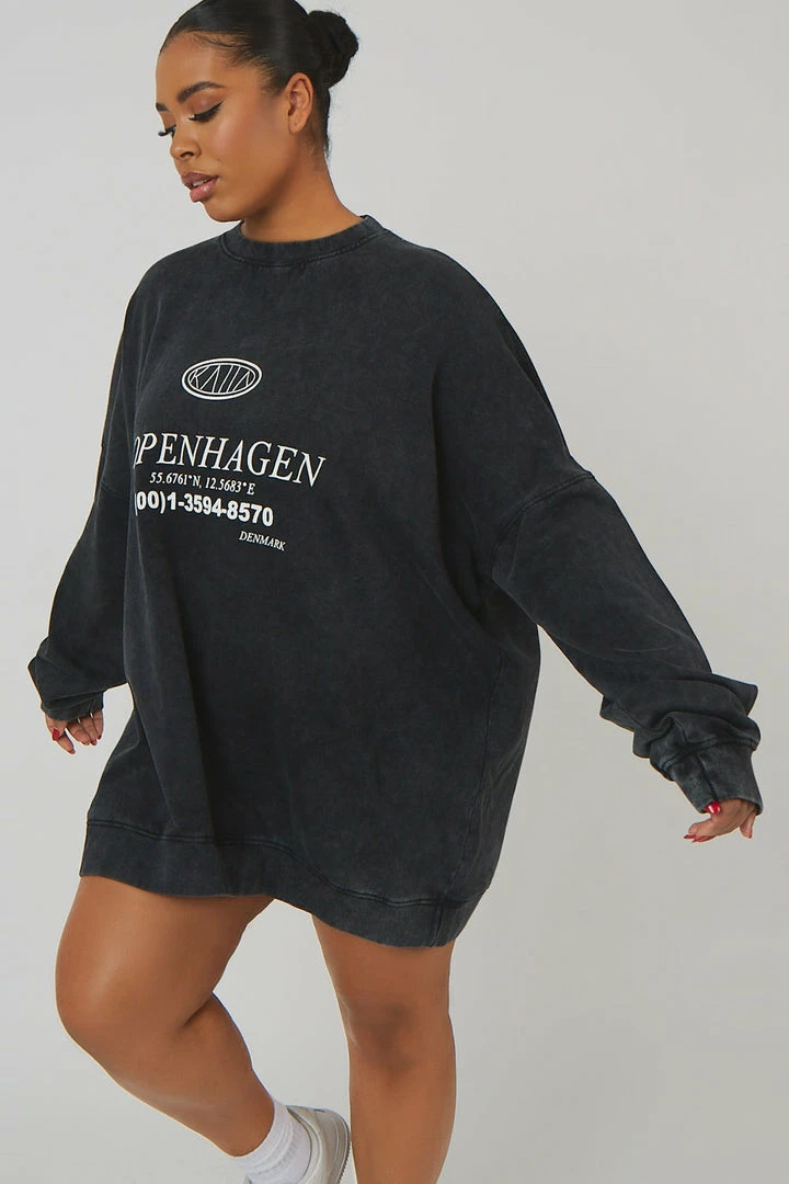 A black sweatshirt with an acid wash effect on with ‘COPENHAGEN’ printed on in white.
