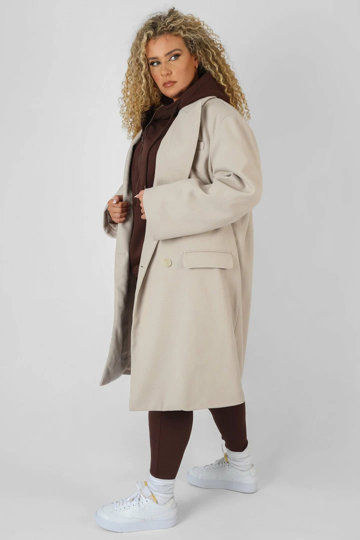 A longline oversized fit wool coat in stone featuring front pockets.
