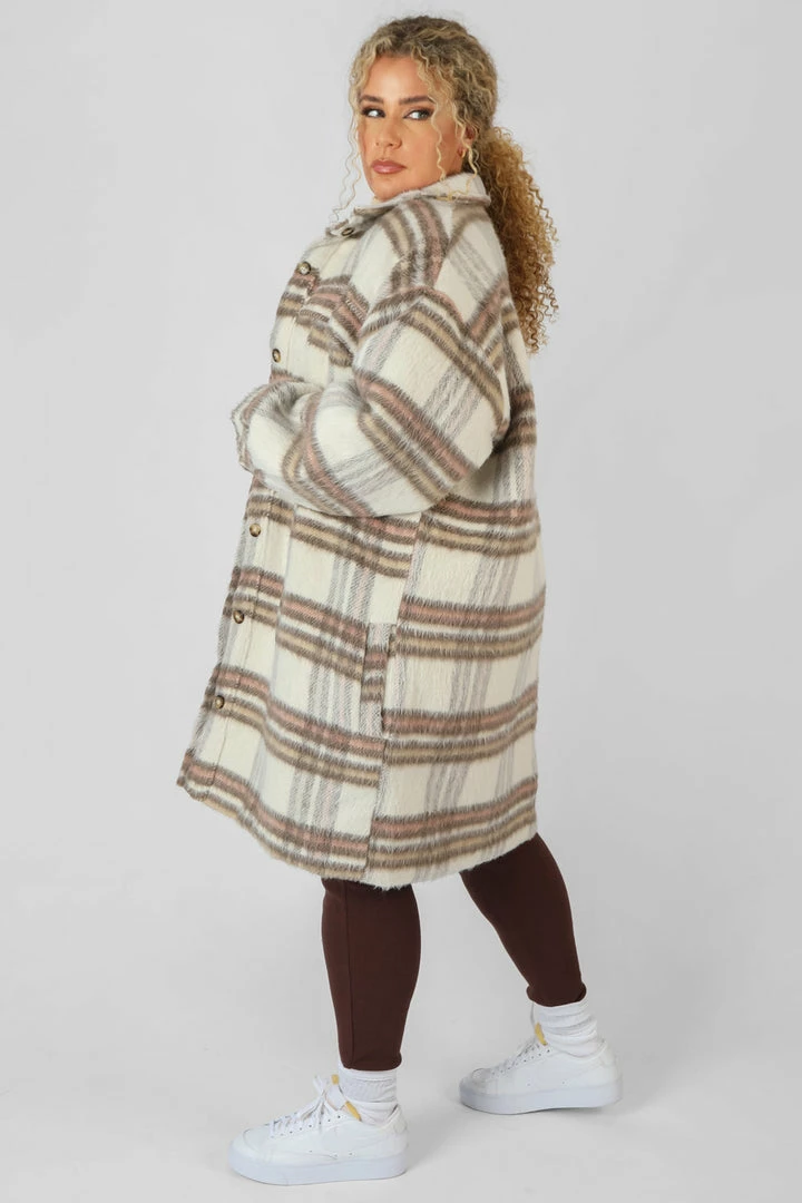 A longline soft touch shacket in a check with quilted lining, button fastenings and front pockets.