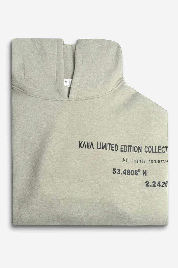 AN OVERSIZED FIT HOODIE WITH BLACK OFF SET TEXT DETAIL IN LIGHT KHAKI