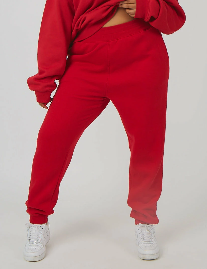The perfect basic high waisted joggers in red with an elasticated waist and cuffs with embroidered detail