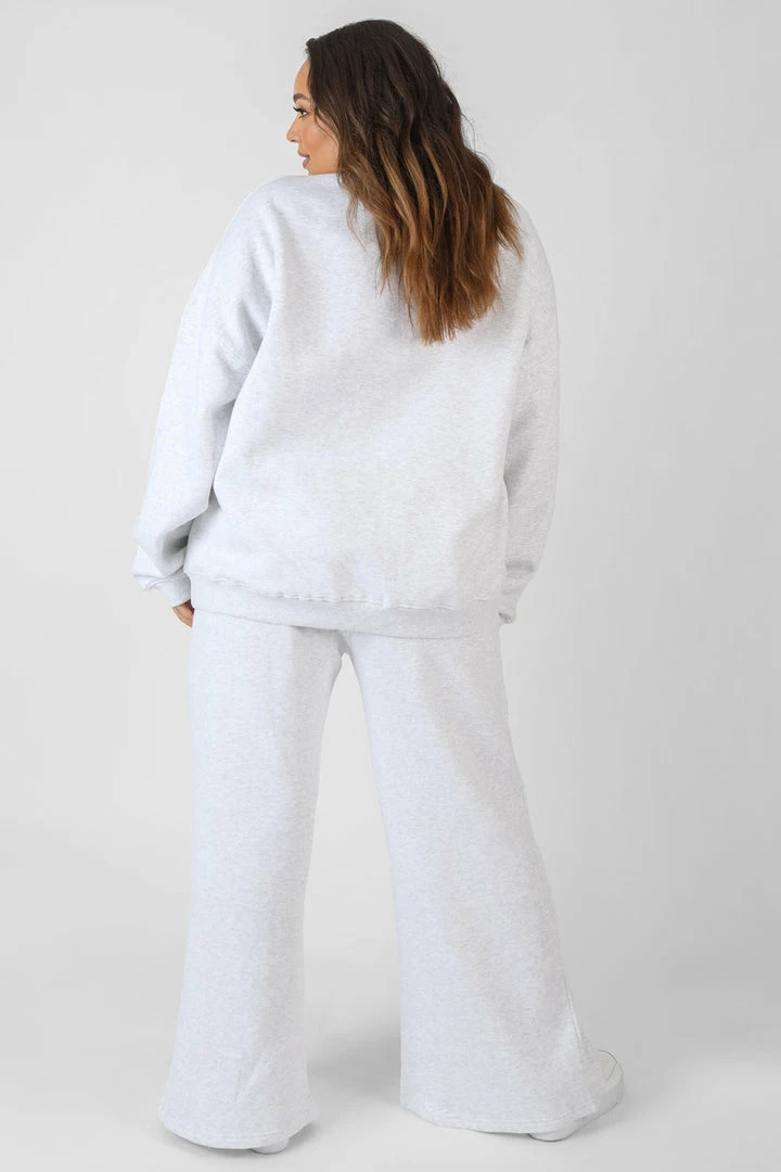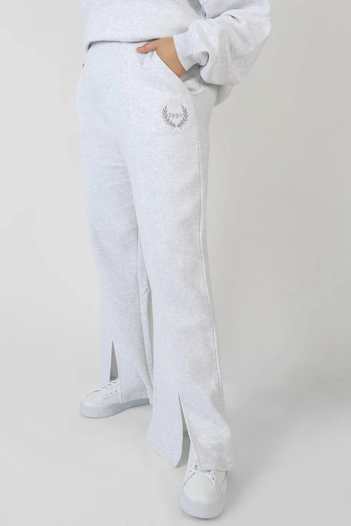 Oatmeal marl straight leg joggers with front split hems and embroidered details.