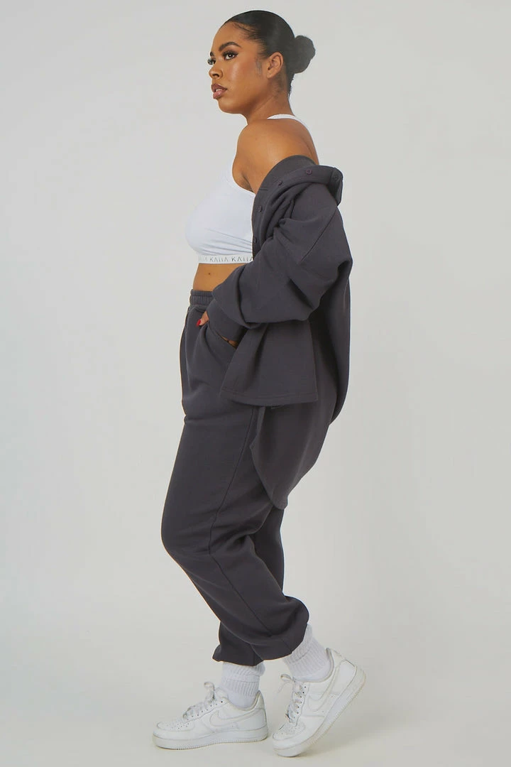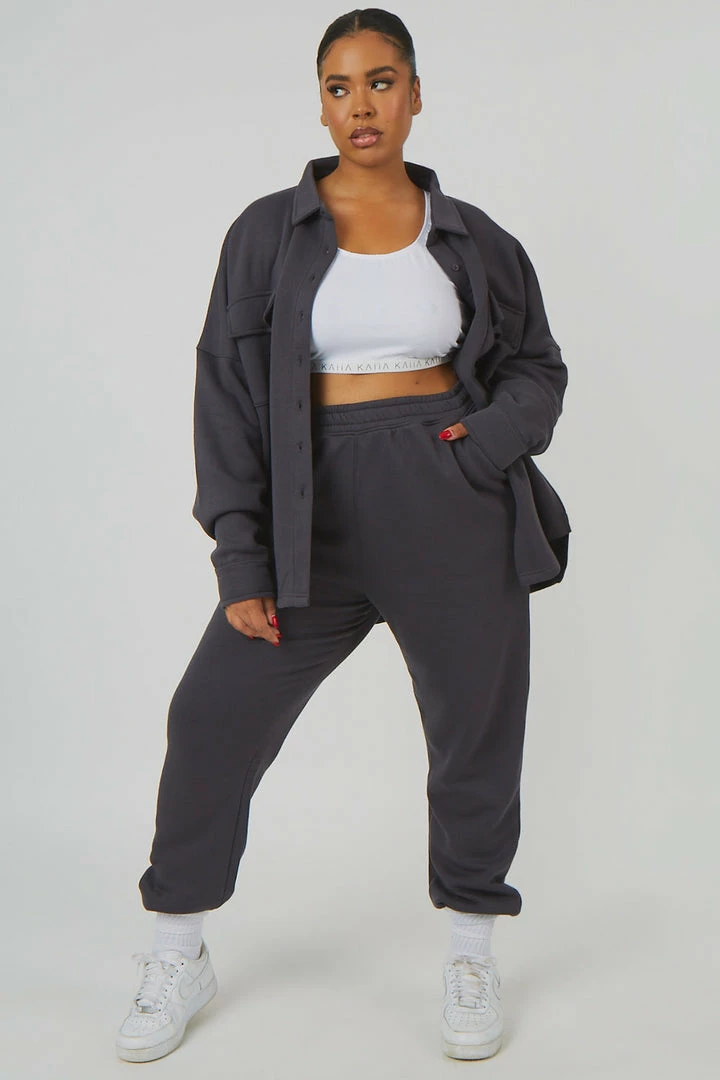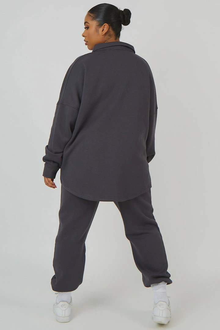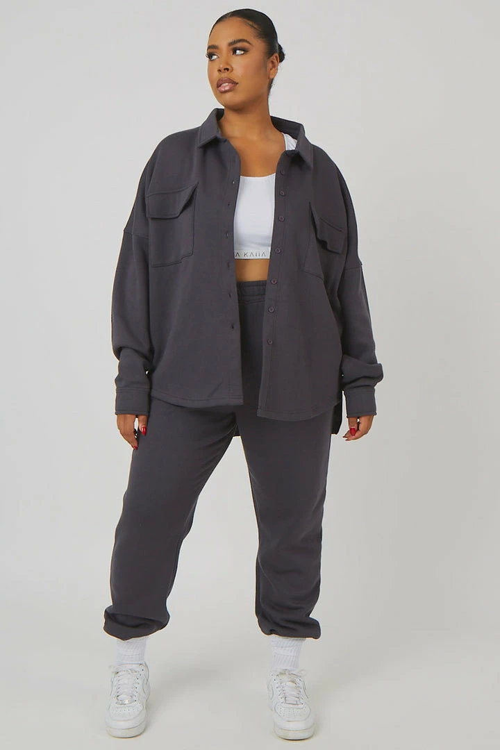 A shacket with an oversized fit featuring front pockets and button fastenings in dark grey.