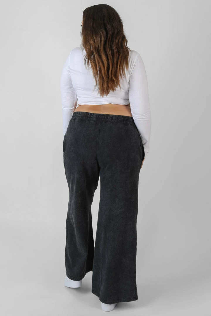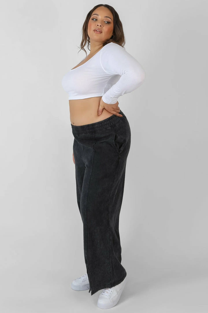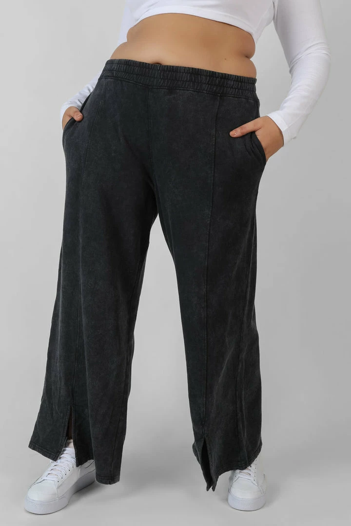 Straight leg joggers with front split hems and embroidered details in an acid wash.