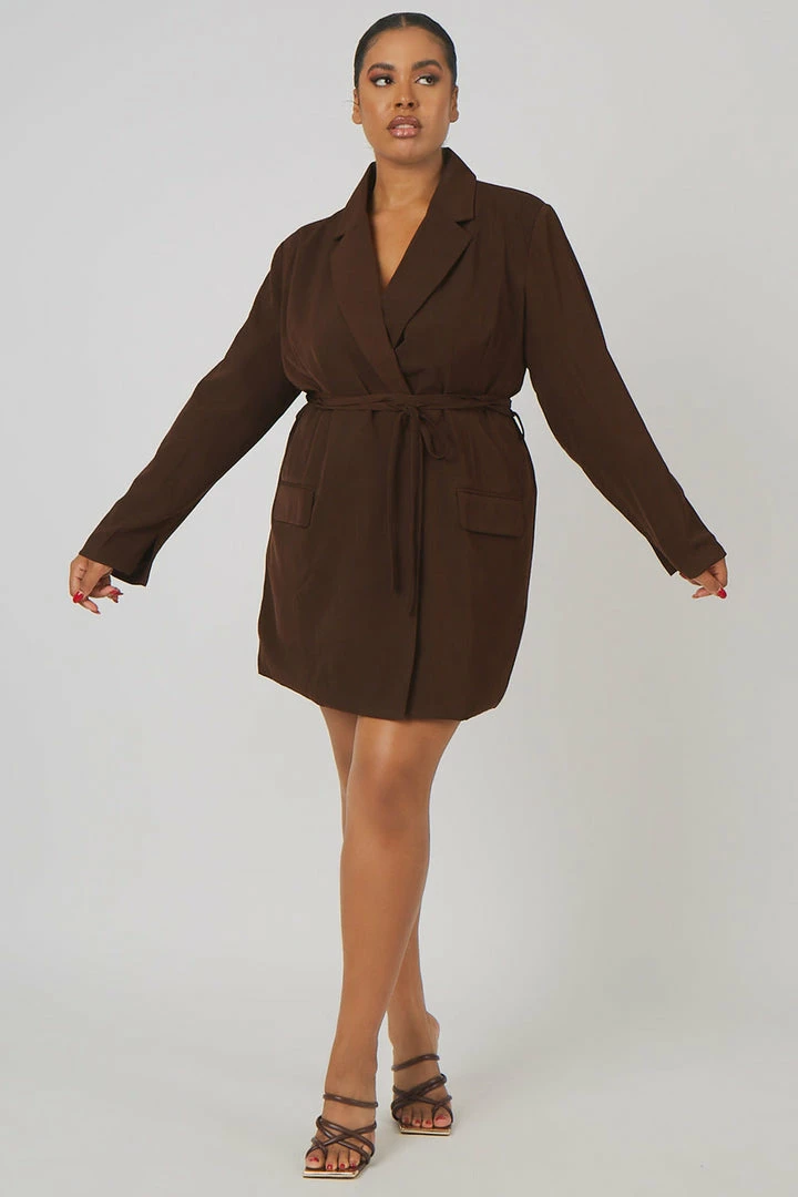 The perfect blazer dress featuring a wrap belt round the waist and front pockets in chocolate.
