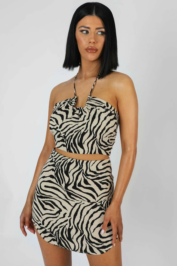 A MINI SKIRT IN STONE ZEBRA PRINT WITH A CURVED HEM.