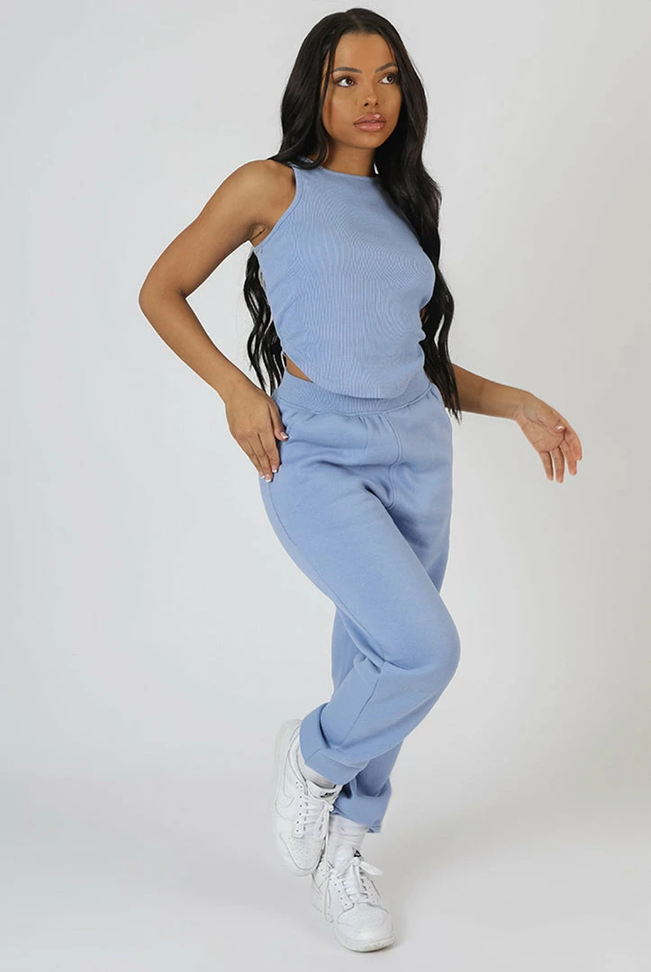 A RACER STYLE CROP TOP IN BLUEBELL WITH A DIPPED HEM.