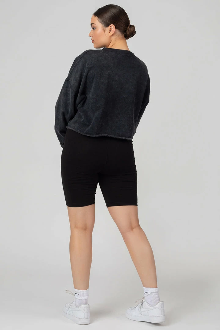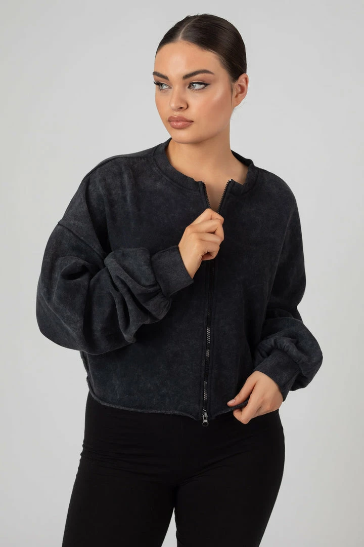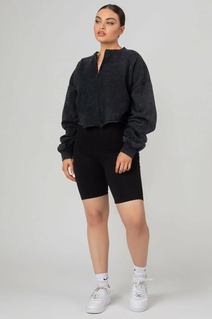 A long sleeve sweatshirt in acid wash with printed detail and a functional zip running from the top to the bottom.