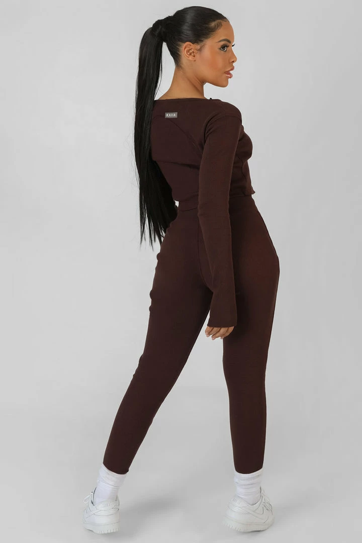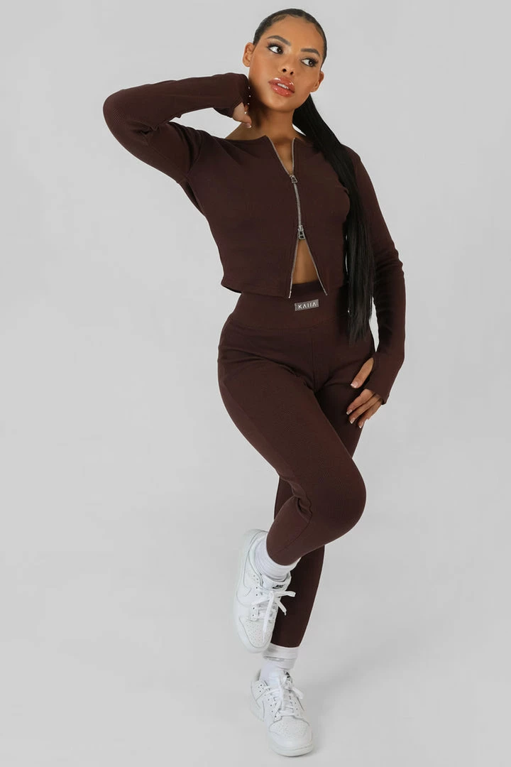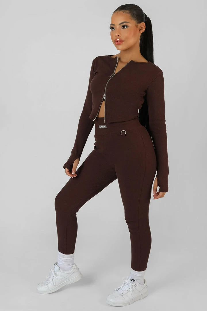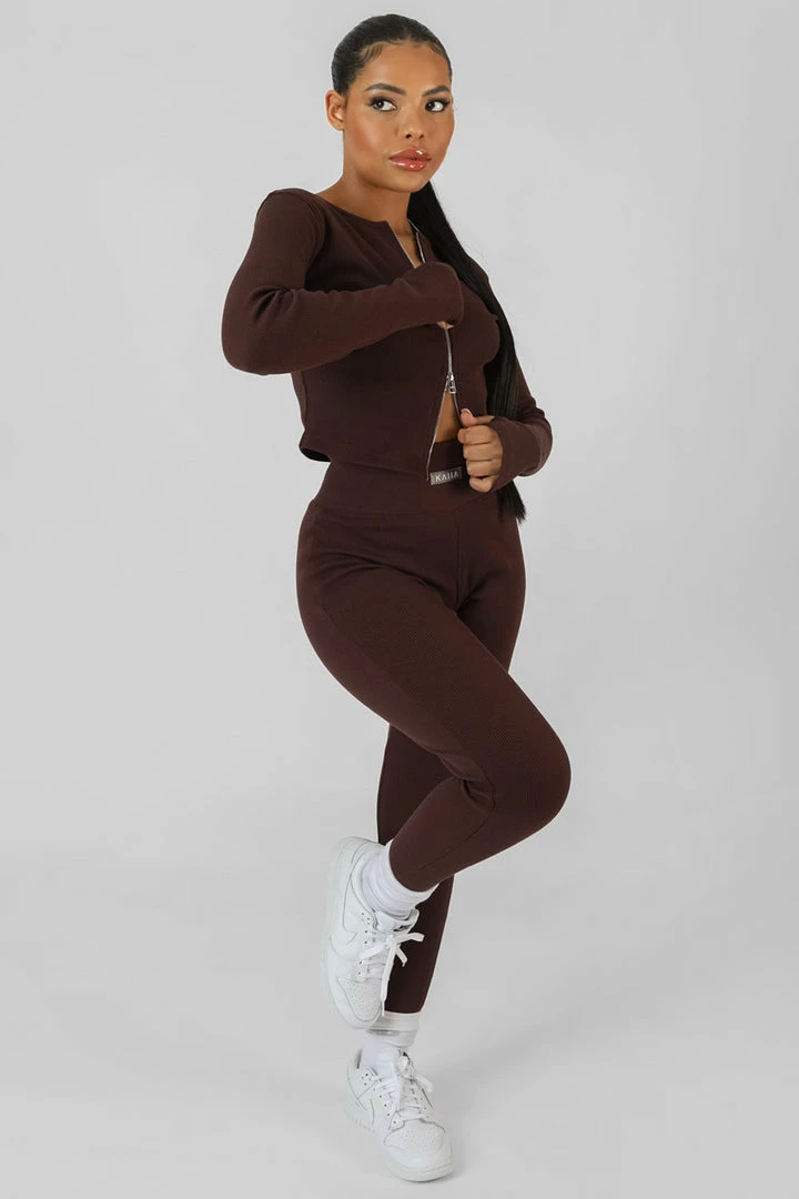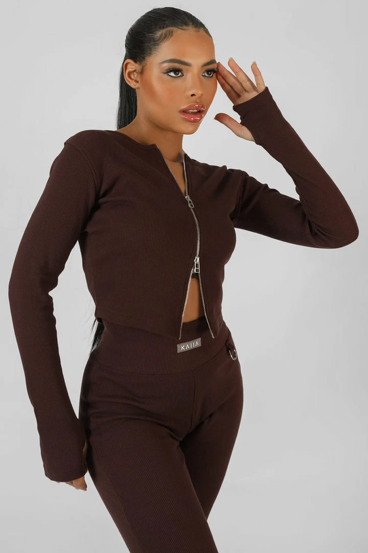 A LONG SLEEVE RIBBED CHOCOLATE LOOSER FITTING TOP WITH A DOUBLE ENDED ZIP RUNNING DOWN THE FRONT