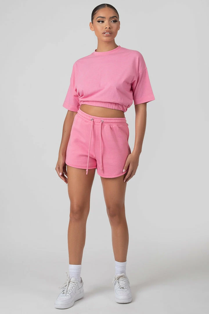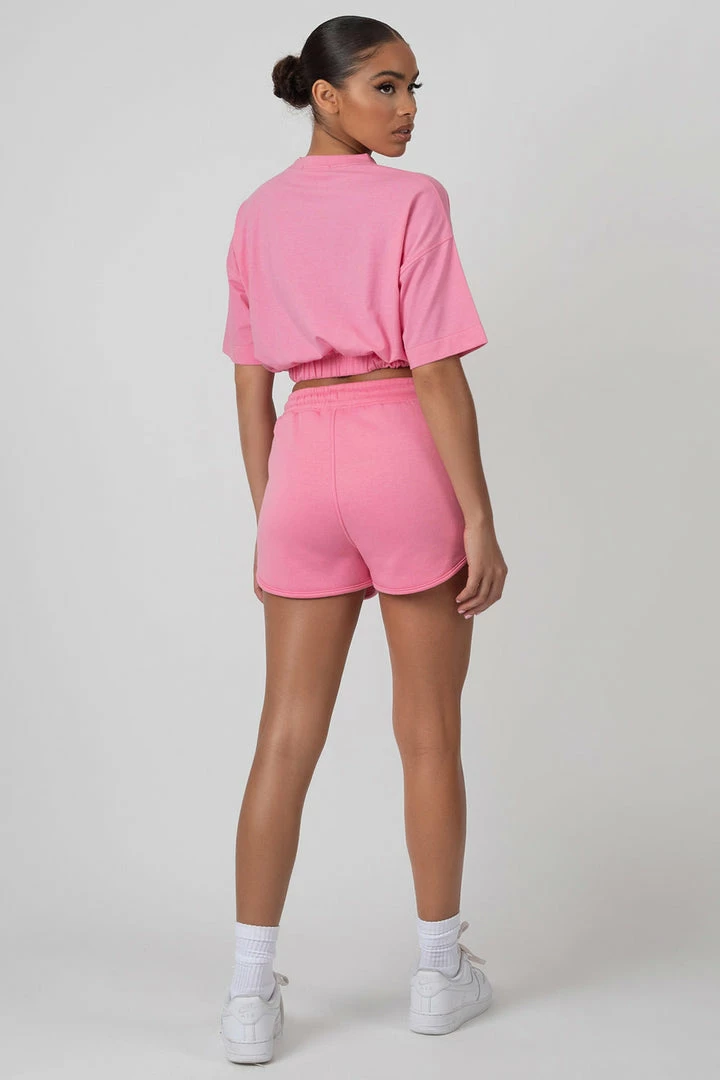 A CUTE PINK CROP TOP WITH ELASTICATED WAIST, PAIRS PERFECTLY WITH OUR PINK BOOTY SHORTS