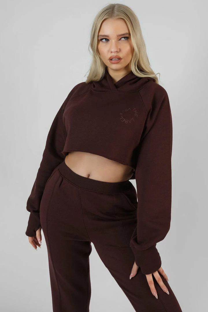 A SUPER CROPPED HOODIE WITH TONAL KAIIA BRANDING EMBROIDERED ON. PAIR WITH THE KAIIA EMBROIDERED SPLIT DETAIL STRAIGHT JOGGERS DARK BROWN FOR THE ULTIMATE SET.