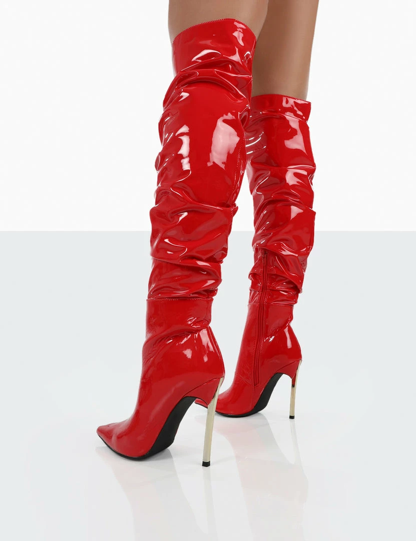 Public Desire UK Energy Red Patent Pointed Toe Over The Knee Heeled Boots
