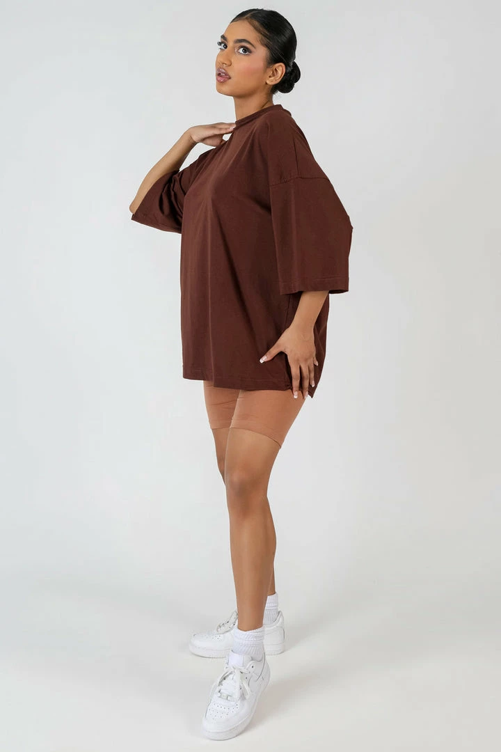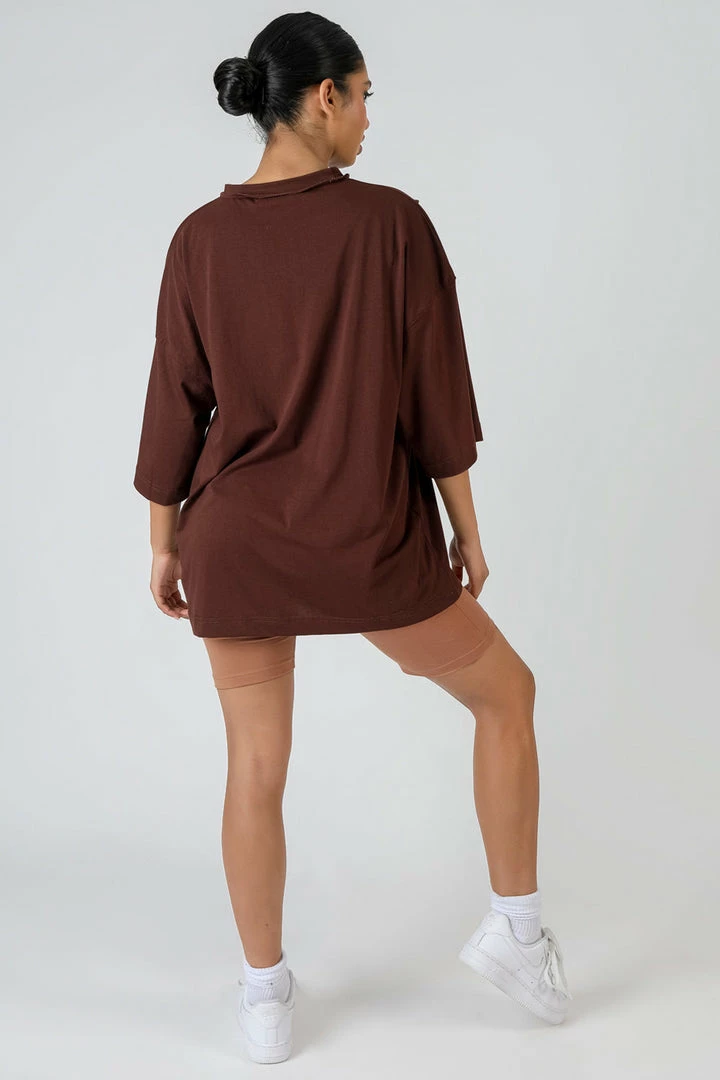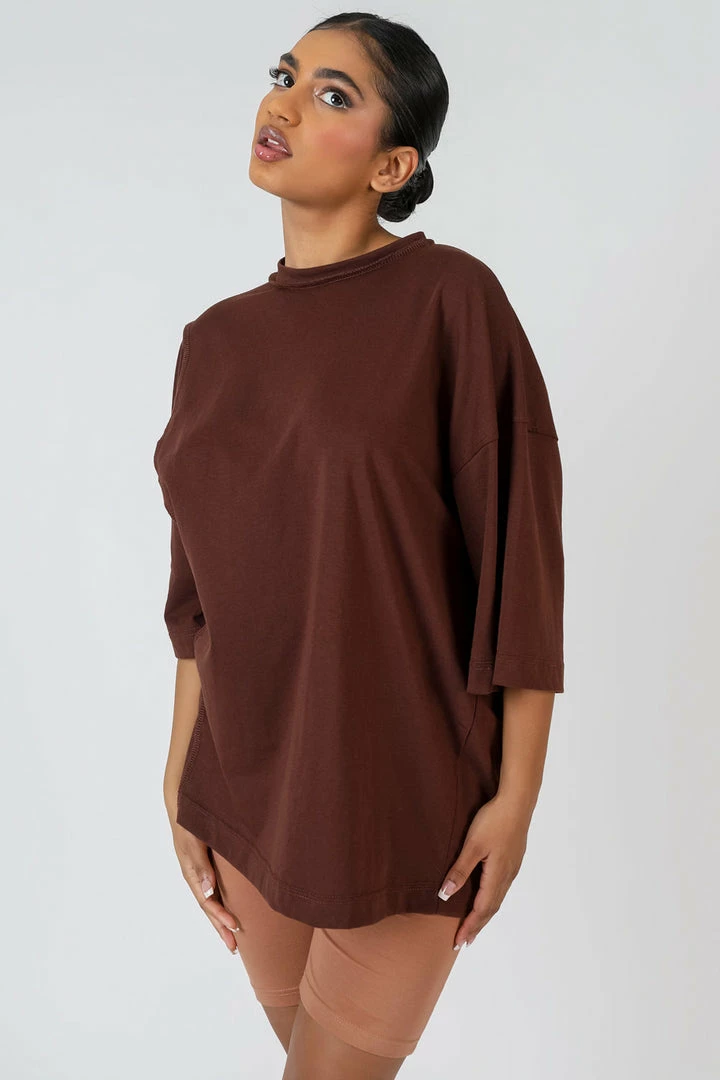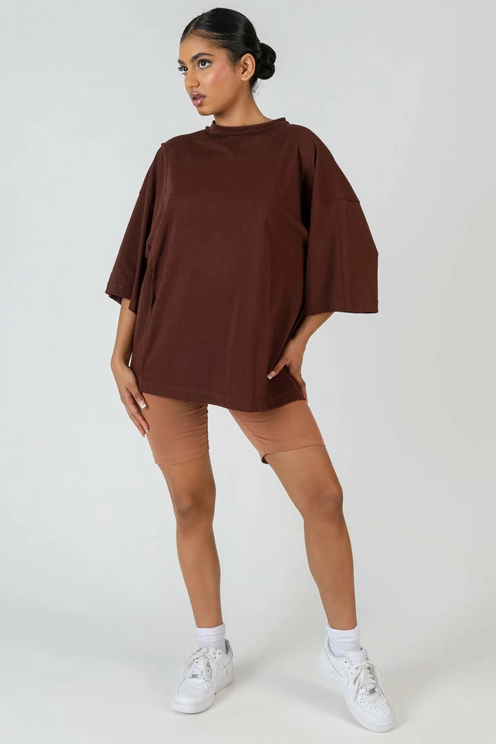 An oversized fit t-shirt with exposed seams in a coffee colour.