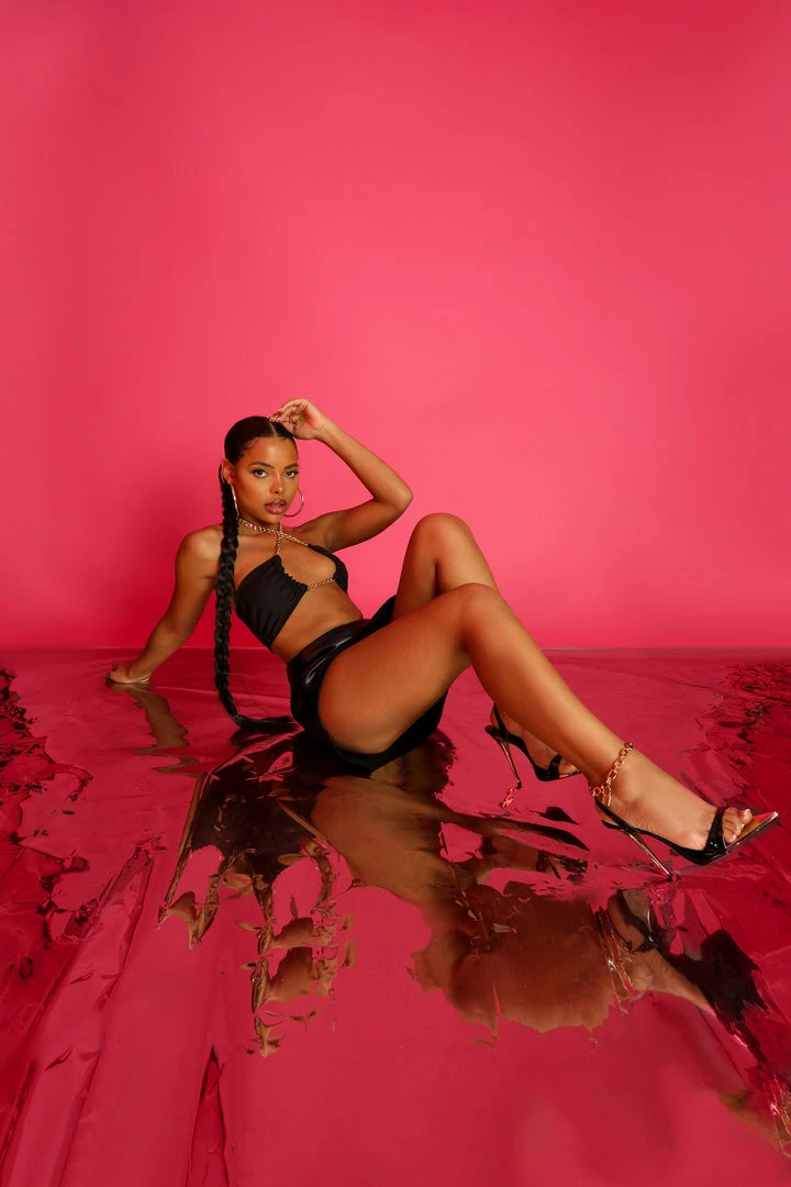 A BLACK PU HIGH WAISTED MINI SKIRT WITH AN EXTREME SIDE SPLIT.