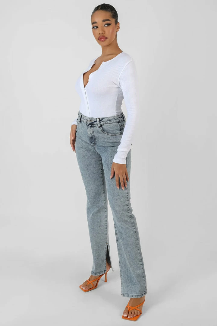 A LONG SLEEVE RIBBED BODYSUIT IN WHITE WITH BUTTONS DOWN THE WHOLE FRONT