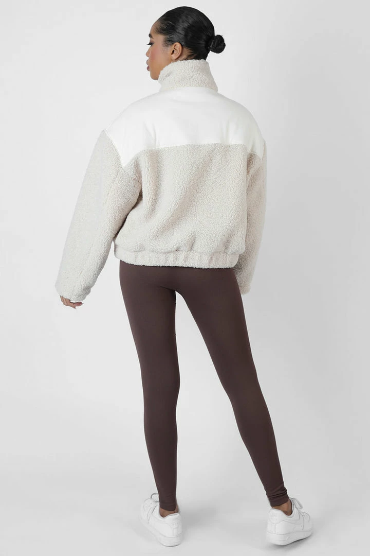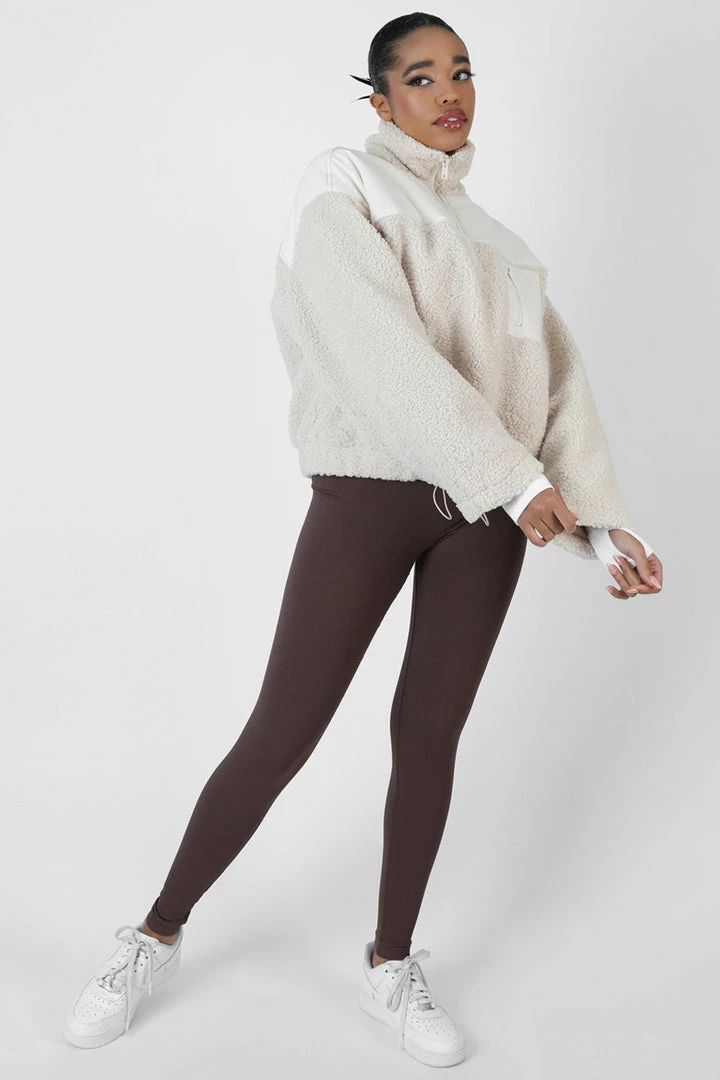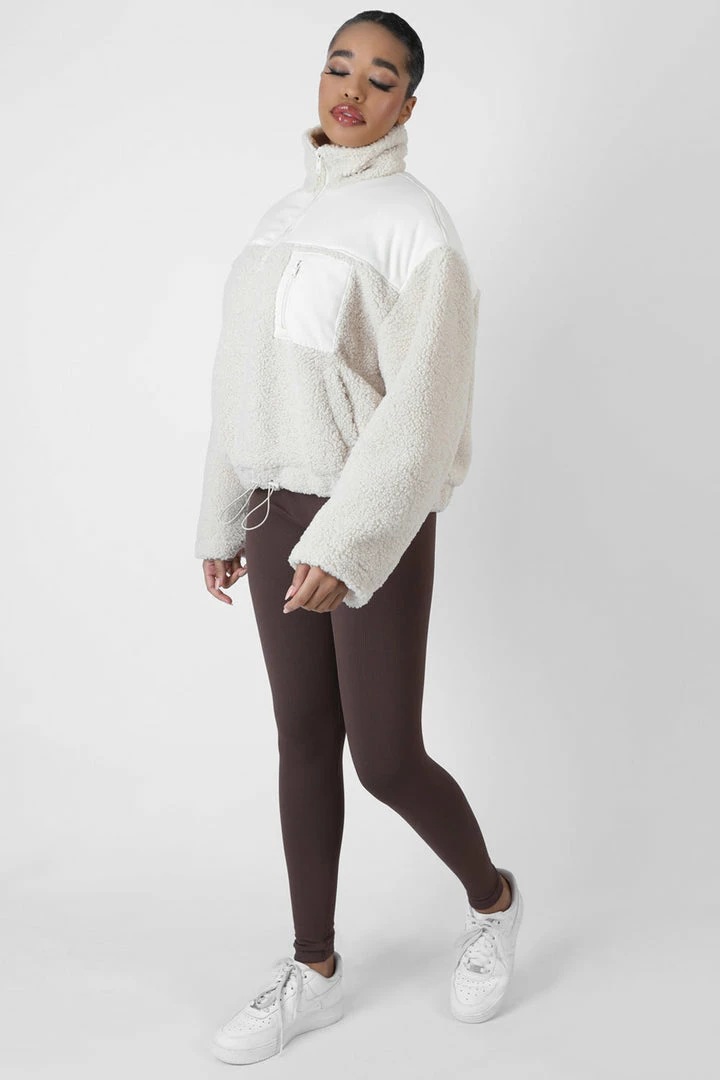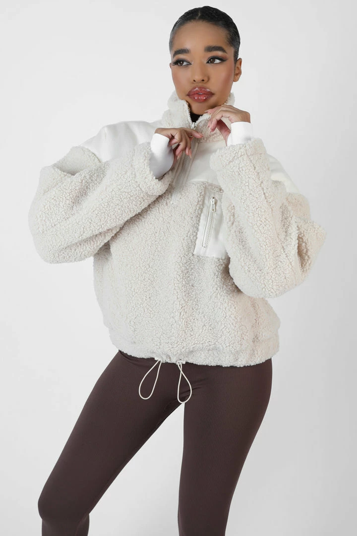 Keep warm this Autumn with this half zip jumper in a borg material featuring a front pocket and cropped design in sand.
