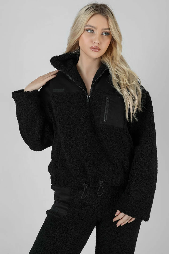 Keep warm this Autumn with this half zip jumper in a borg material featuring a front pocket and cropped design in black.