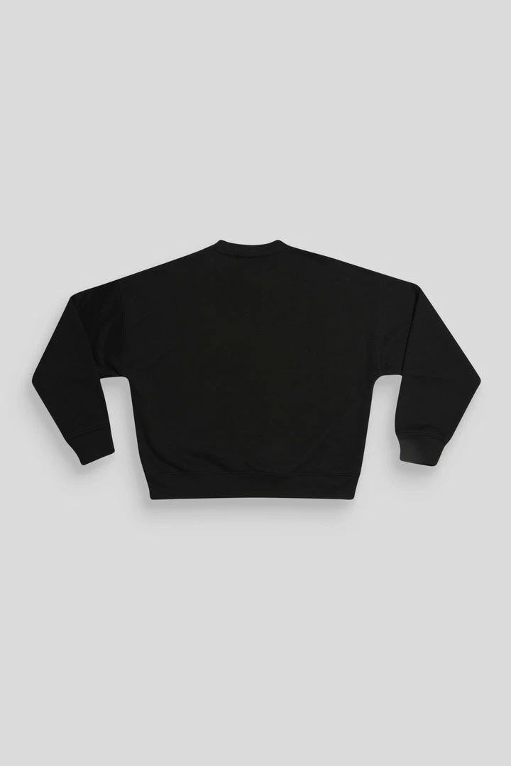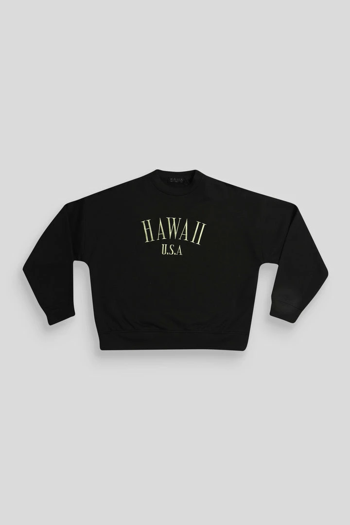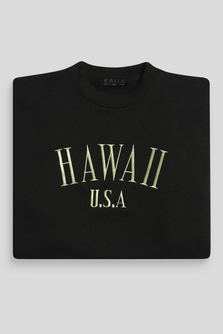 AN OVERSIZED FIT SLIGHLTY CROPPED BLACK SWEATSHIRT WITH HAWAII EMBROIDERED ON THE FRONT IN YELLOW