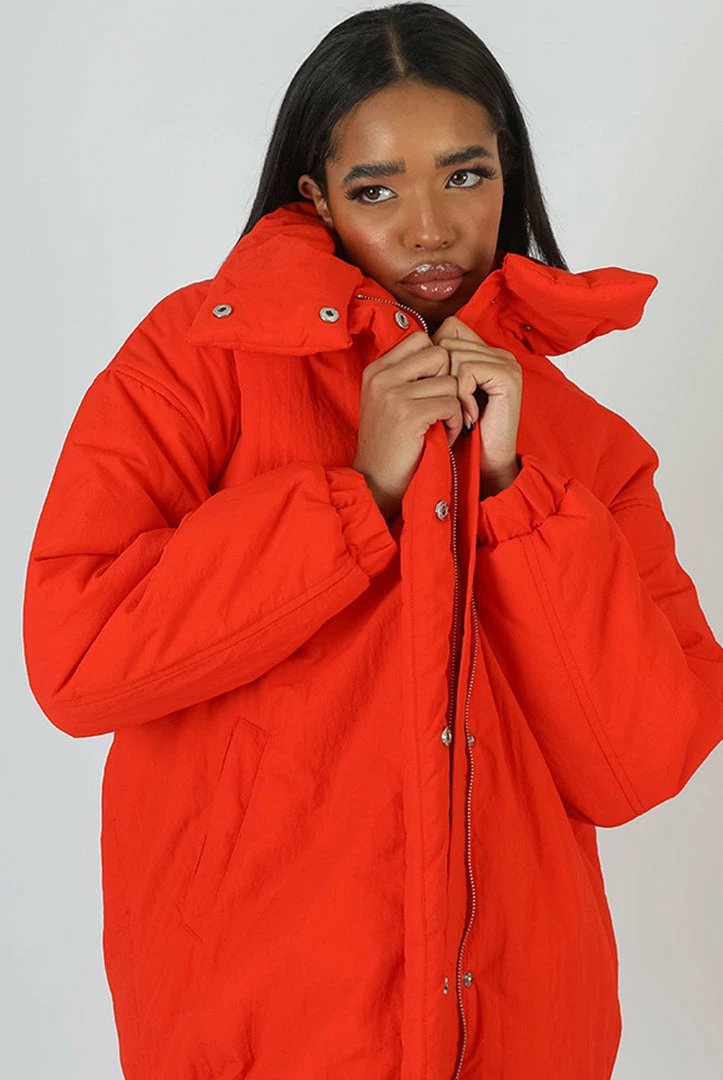 Make a statement with this oversized, high neck puffer jacket in orange featuring a zip fastening.