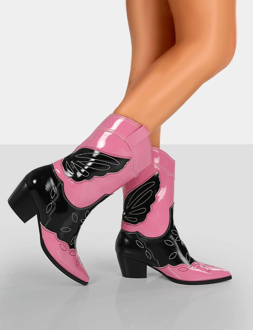Public Desire UK Howdy Pink Patent Pointed Toe Western Cowboy Ankle Boots NEW IN