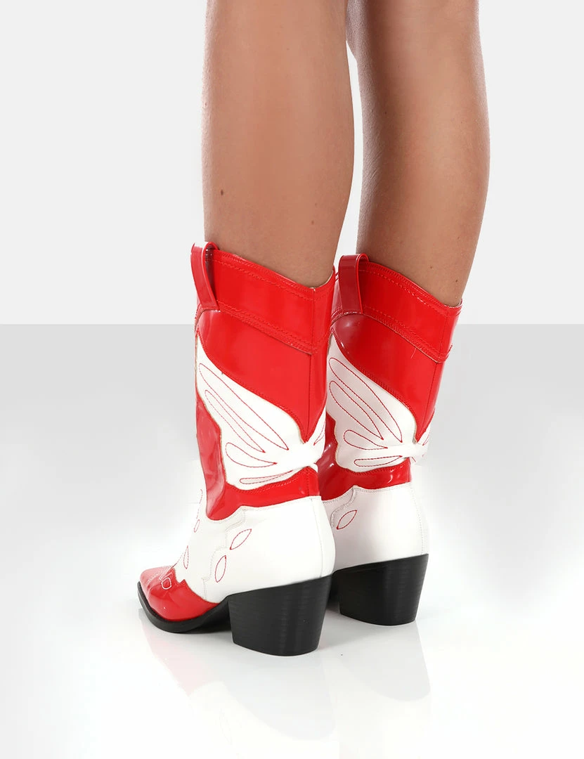 Public Desire UK Howdy Red Patent Pointed Toe Western Cowboy Ankle Boots