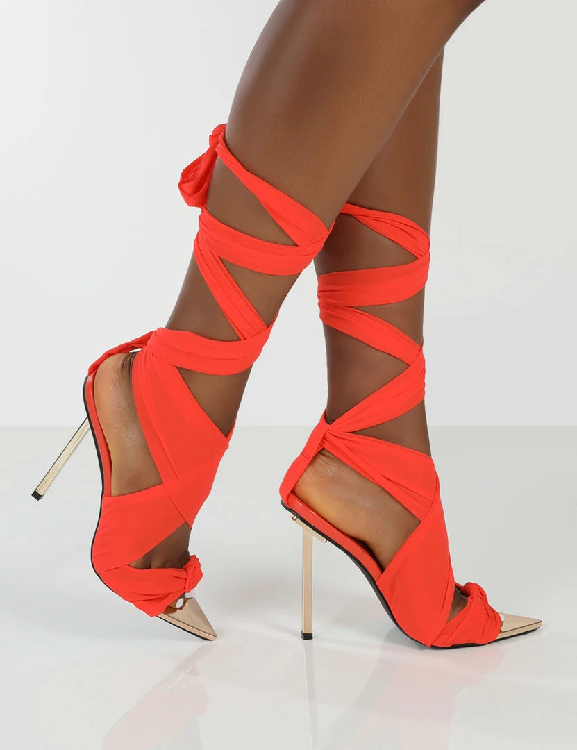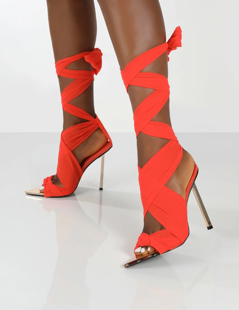 Huni features ribbon lace up ankle straps with a gold stiletto heel. These shoes are the ultimate glam heels that we are loving!