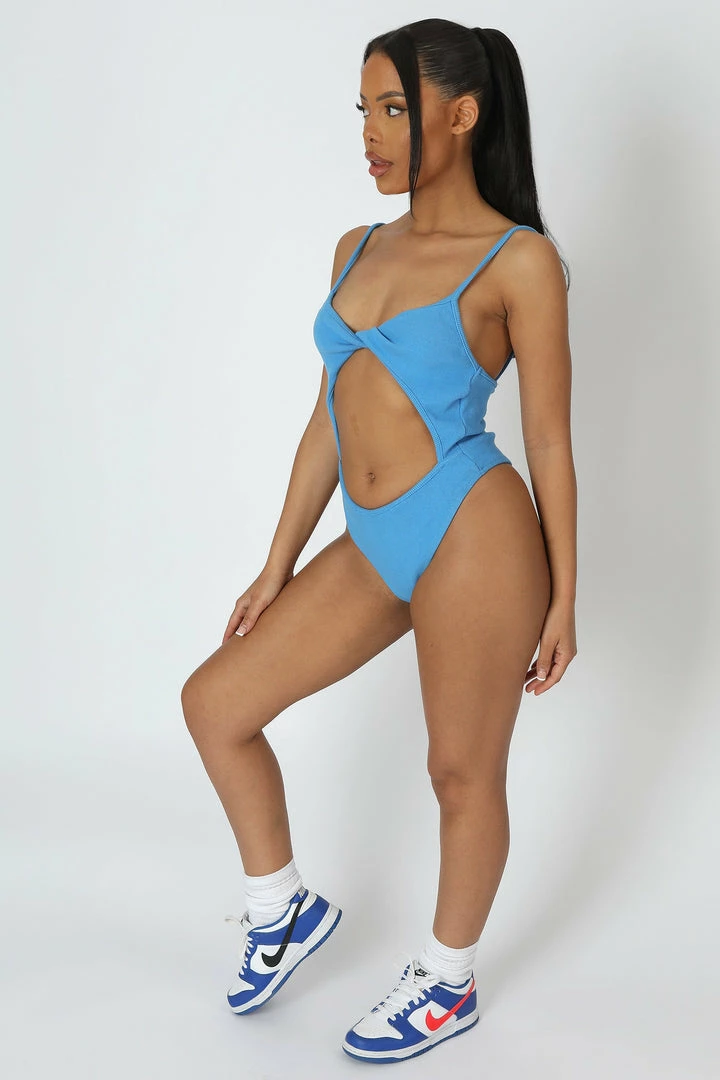 A bodysuit in blue with high legs and a twist front detail made of a flattering ribbed material.