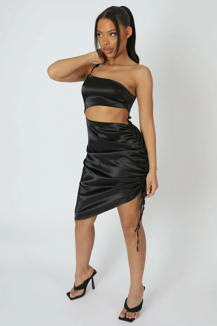 A MIDI BLACK SATIN DRESS FEATURING ASYMMETRIC STRAPS AND HEM, FLATTERING RUCHING AND A CUT OUT IN THE MIDRIFT.