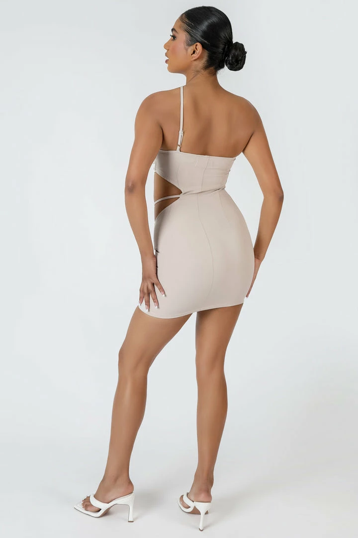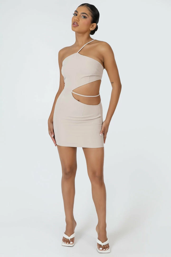 Update your Autumn wardrobe with this asymmetric mini dress with a cutout waist detail in stone.