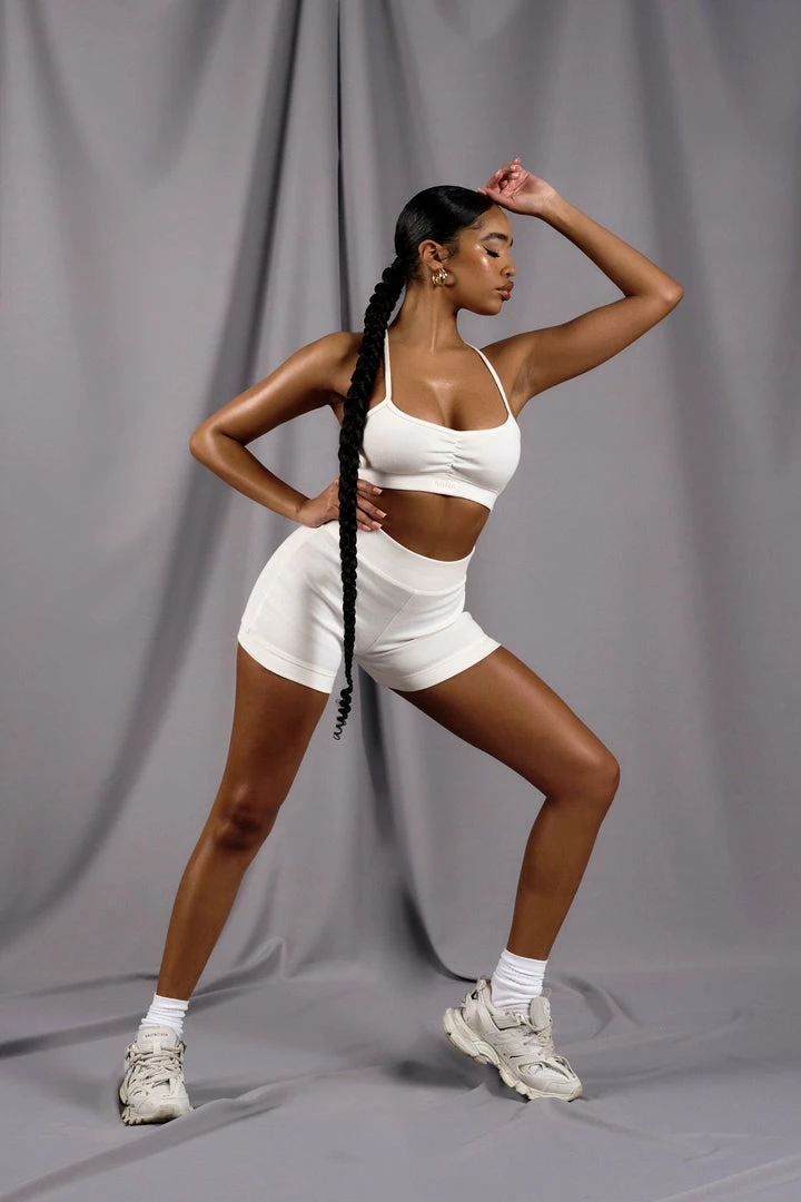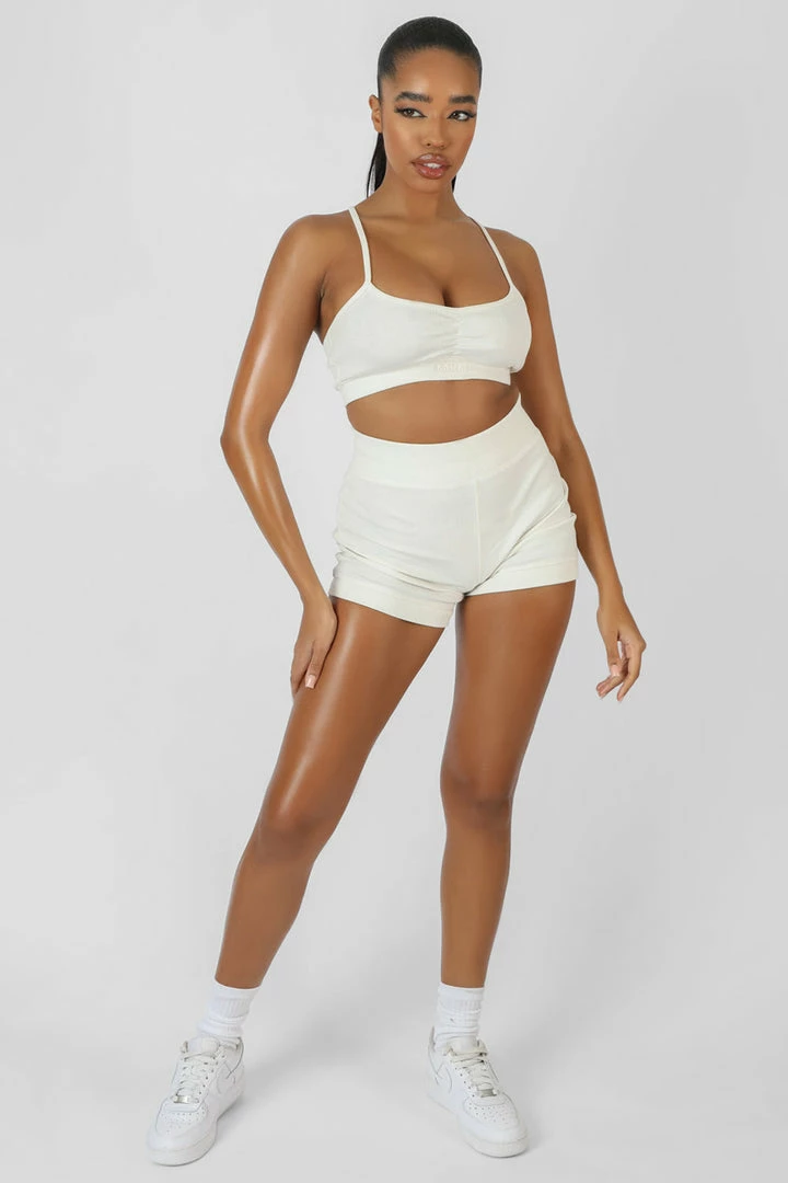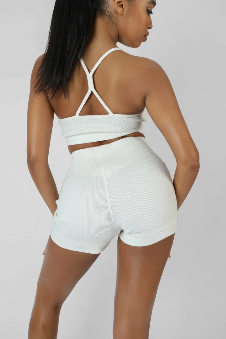 ATHLEISURE WEAR STYLE WHITE RIBBED HIGH WAISTED BOOTY SHORTS