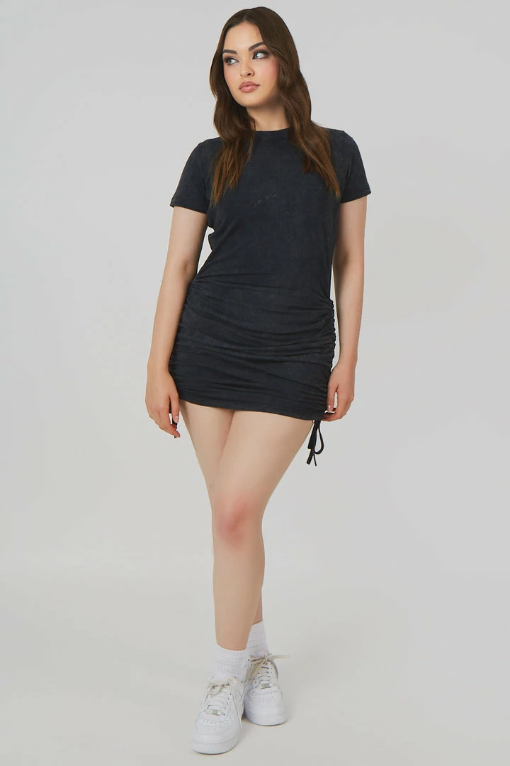 A short sleeve crew neck mini dress in acid wash featuring flattering ruching down the sides of the skirt