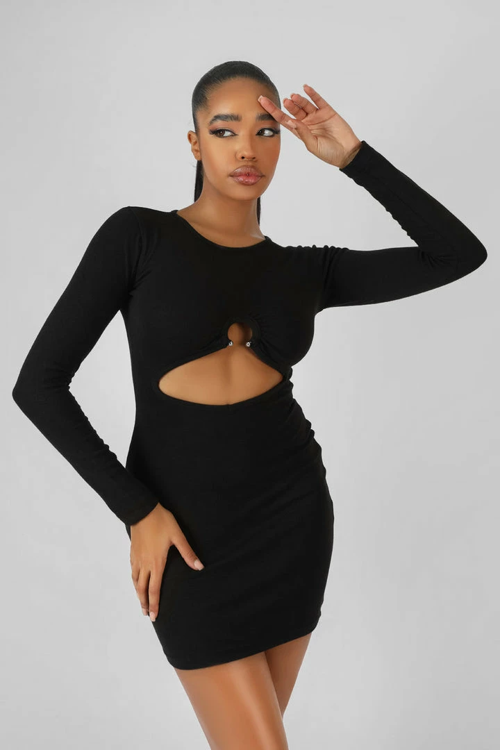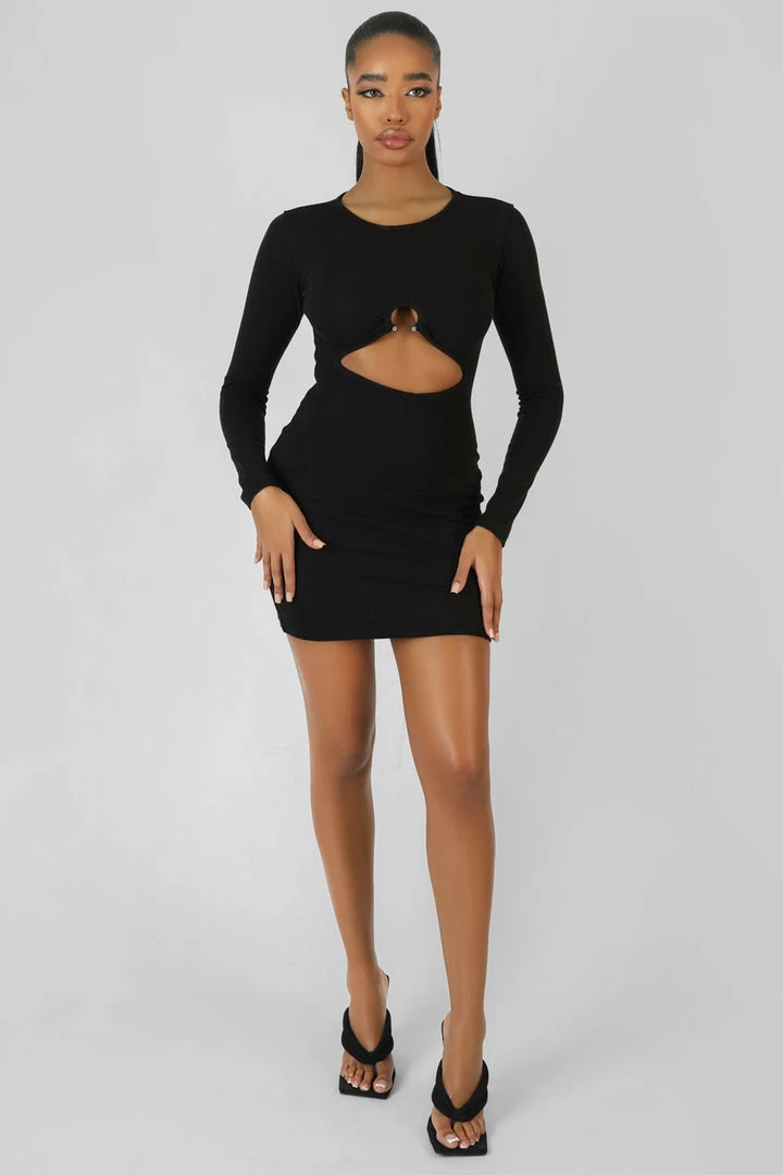 A BLACK BODYCON MINI DRESS IN BLACK WITH A CUT OUT AND BULL RING DETAIL.
