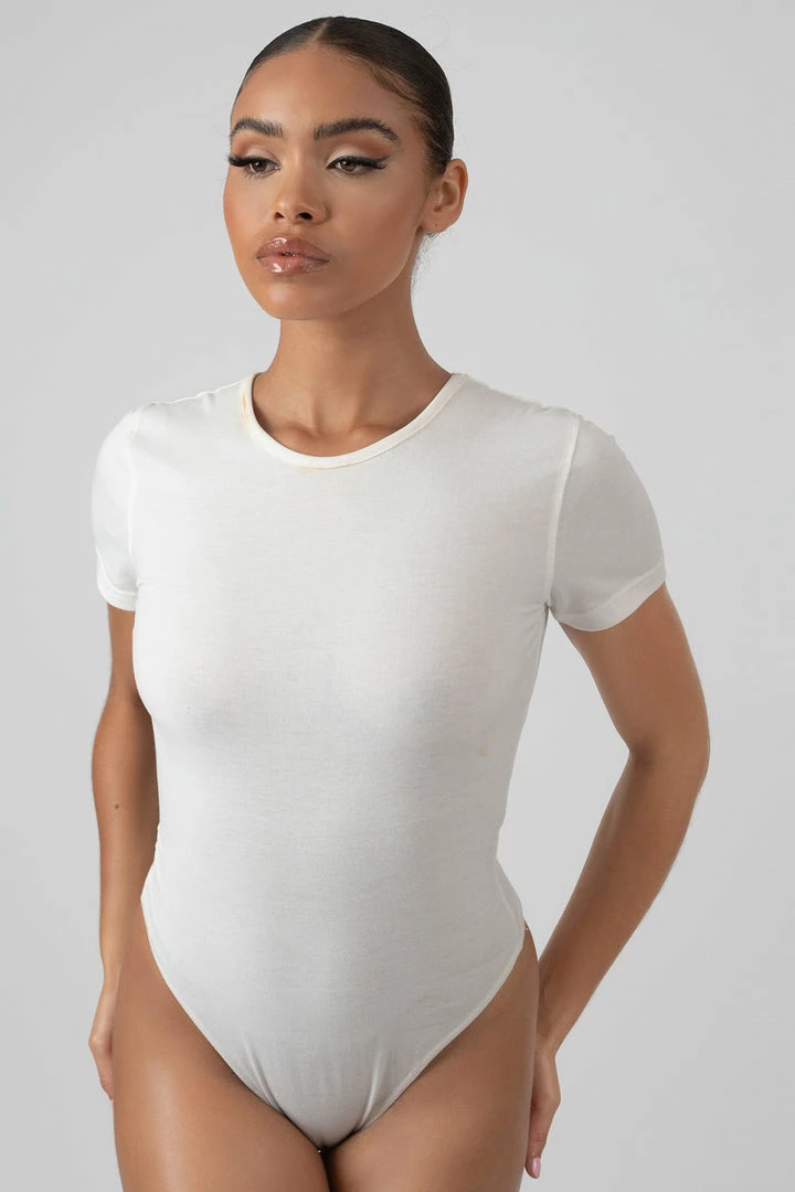 A cap sleeved t-shirt thong bodysuit in white with clasps.