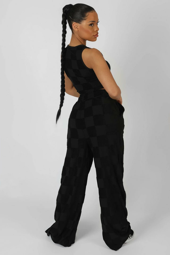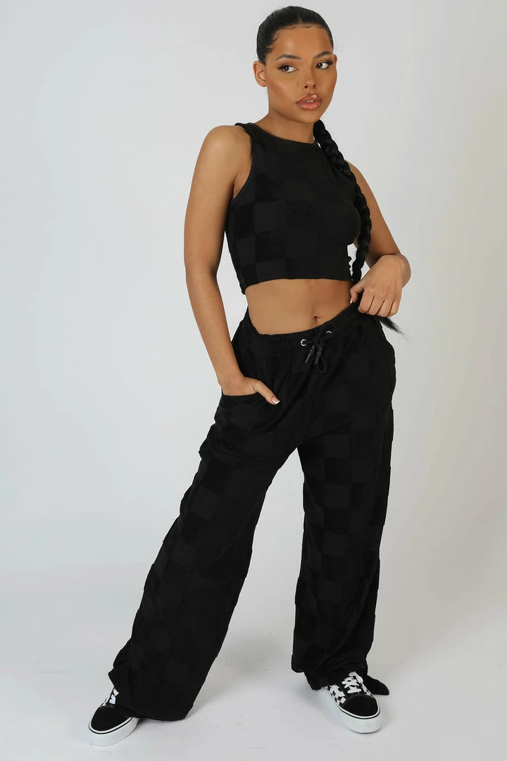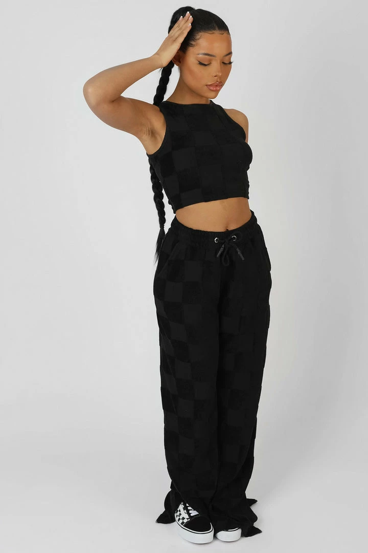 A RACER STYLE CROP TOP IN BLACK TONAL CHECKBOARD TOWELLING