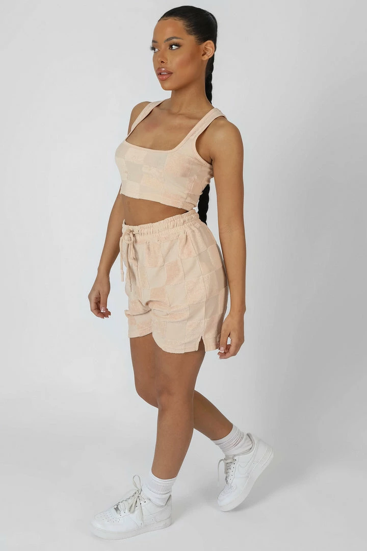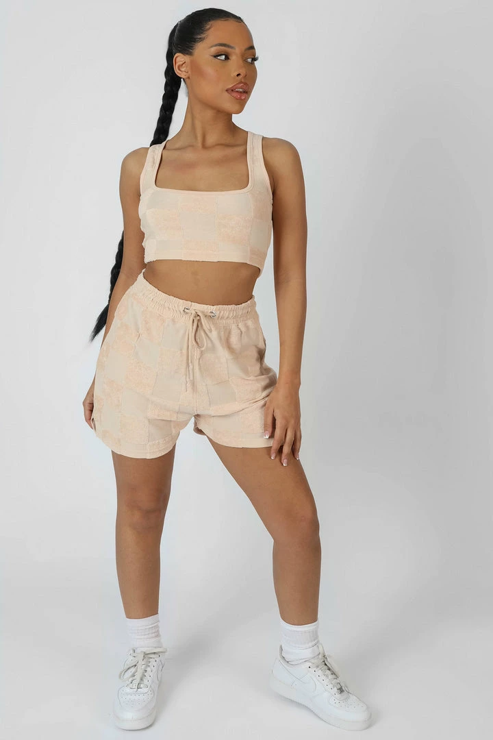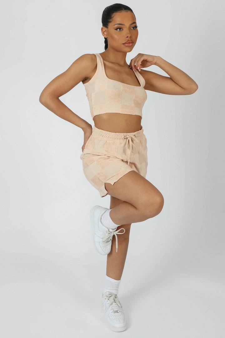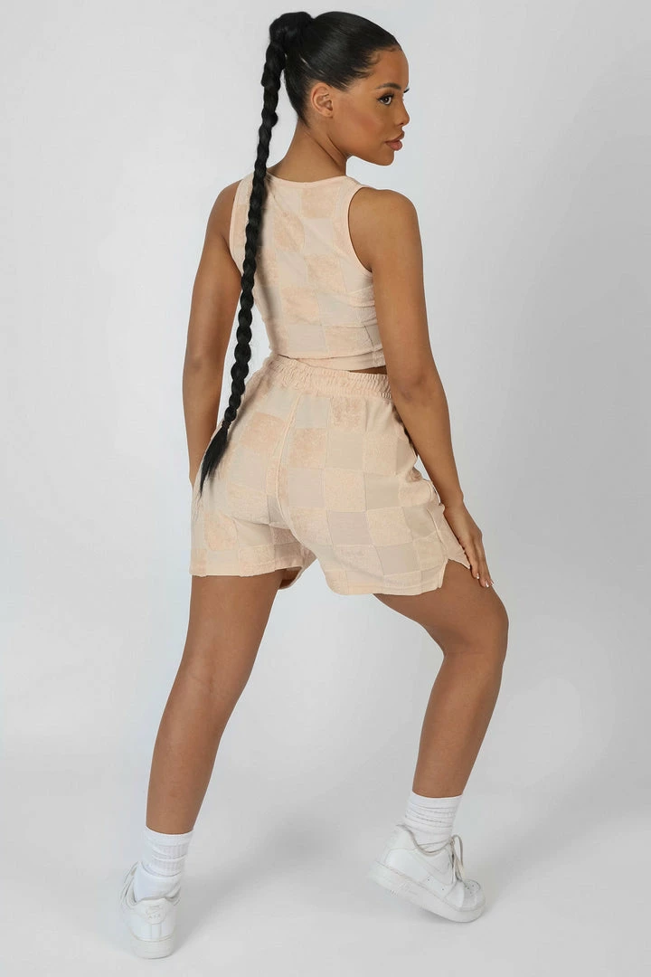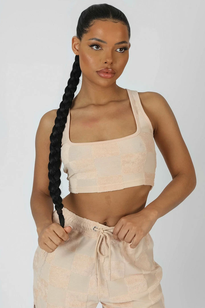 A SCOOP NECK CROP TOP IN SAND TONAL CHECKBOARD