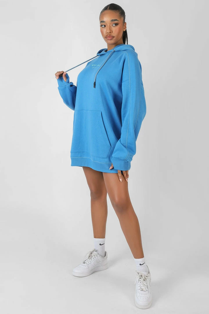 An oversized fit hoodie dress in blue with contrasting lighter blue stitching featuring a drawstring on the hood, a front pocket and a cuffed hem and sleeves.